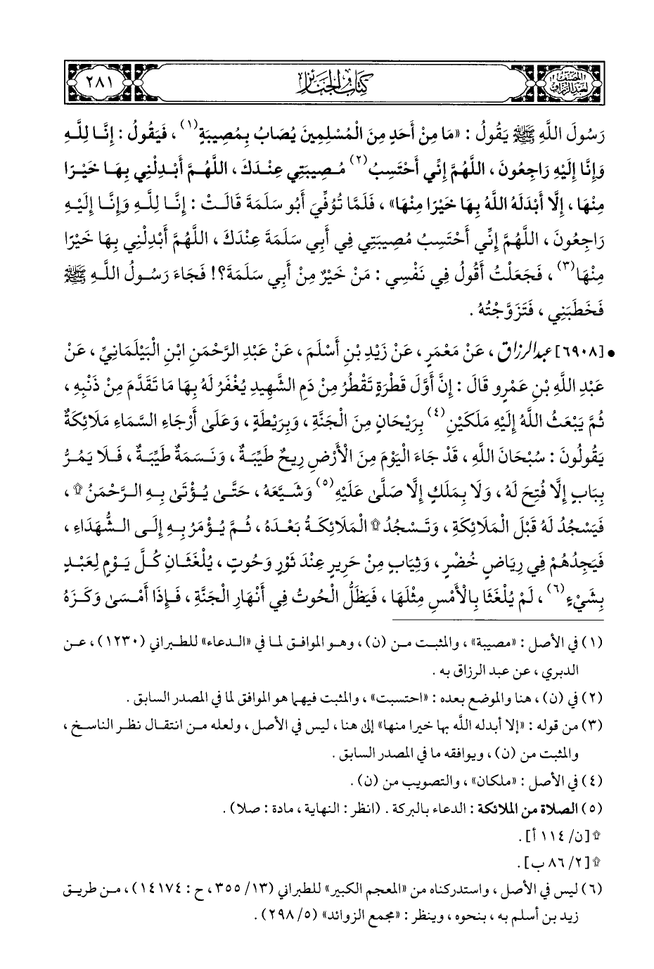 • [٦٩٠٨] عبد الرزاق، عَنْ مَعْمَرٍ، عَنْ زَيْدِ بْنِ أَسْلَمَ، عَنْ عَبْدِ الرَّحْمَنِ ابْنِ الْبَيْلَمَانِيِّ، عَنْ عَبْدِ اللَّهِ بْنِ عَمْرٍو قَالَ: إِنَّ أَوُّلَ قَطْرَةٍ تَقْطُرُ مِنْ دَمِ الشَّهِيدِ يُغْفَرُ لَهُ بِهَا مَا تَقَدَّمَ مِنْ ذَنْبِهِ، ثُمَّ يَبْعَثُ اللَّهُ إِلَيْهِ مَلَكَيْنِ (¬٤) بِرَيْحَانٍ مِنَ الْجَنَّةِ، وَبِرَيْطَةٍ، وَعَلَى أَرْجَاءِ السَّمَاءِ مَلَائِكَةٌ يَقُولُونَ: سُبْحَانَ اللَّهِ، قَدْ جَاءَ الْيَوْمَ مِنَ الْأَرْضِ رِيحٌ طَيِّبَةٌ، وَنَسَمَةٌ طَيبَةٌ، فَلَا يَمُرُّ بِبَابٍ إِلَّا فُتِحَ لَهُ، وَلَا بِمَلَكٍ إِلَّا صَلَّى عَلَيْهِ (¬٥) وَشَيَّعَهُ، حَتَّى يُؤْتَى بِهِ الرَّحْمَنُ *، فَيَسْجُدُ لَهُ قَبْلَ الْمَلَائِكَةِ، وَتَسْجُدُ * الْمَلَائِكَةُ بَعْدَهُ، ثُمَّ يُؤْمَرُ بِهِ إِلَى الشُّهَدَاءِ، فَيَجِدُهُمْ فِي رِيَاضٍ خُضْرٍ، وَثِيَابٍ مِنْ حَرِيرٍ عِنْدَ ثَوْرٍ وَحُوتٍ، يُلْغَثَانِ كُلَّ يَوْمٍ لِعَبْدٍ بِشَيْءٍ (¬٦)، لَمْ يُلْغَثَا بِالْأَمْسِ مِثْلَهَا، فَيَظَلُّ الْحُوتُ فِي أَنْهَارِ الْجَنَّةِ، فَإِذَا أَمْسَى وَكَزَهُ