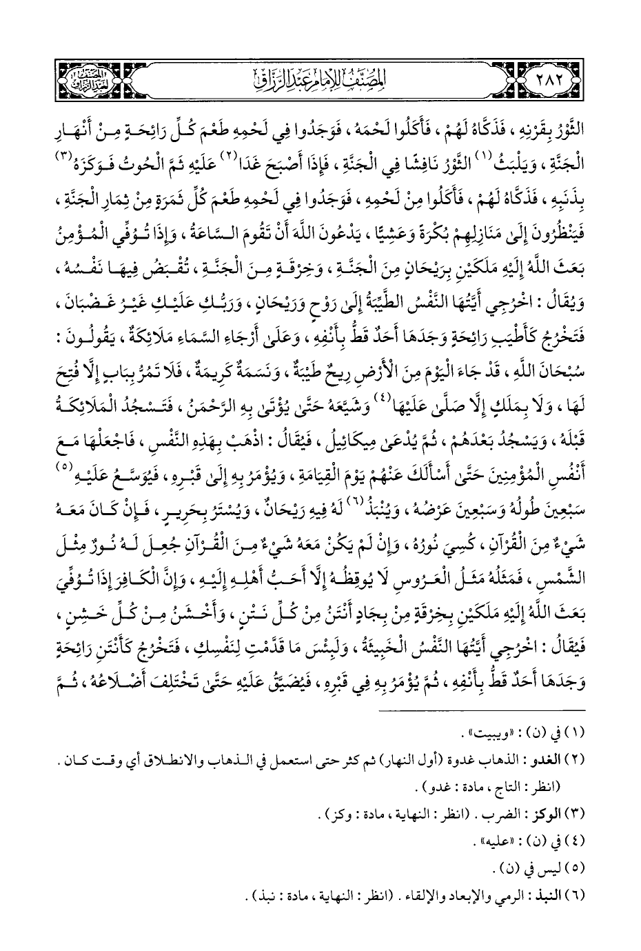 الثَّوْرُ بِقَرْنِهِ، فَذَكَّاهُ لَهُمْ، فَأَكَلُوا لَحْمَهُ، فَوَجَدُوا فِي لَحْمِهِ طَعْمَ كُلِّ رَائِحَةٍ مِنْ أَنْهَارِ الْجَنَّةِ، وَيَلْبَثُ (¬١) الثَّوْرُ نَافِشًا فِي الْجَنَّةِ، فَإِذَا أَصْبَحَ غَدَا (¬٢) عَلَيْهِ ثَمَّ الْحُوتُ فَوَكَزَهُ (¬٣) بِذَنَبِهِ، فَذَكَّاهُ لَهُمْ، فَأَكَلُوا مِنْ لَحْمِهِ، فَوَجَدُوا فِي لَحْمِهِ طَعْمَ كُلِّ ثَمَرَةٍ مِنْ ثِمَارِ الْجَنَّةِ، فَيَنْظُرُونَ إِلَى مَنَازِلِهِمْ بُكْرَةً وَعَشِيًّا، يَدْعُونَ اللَّهَ أَنْ تَقُومَ السَّاعَةُ، وإِذَا تُوُفِّي الْمُؤْمِنُ بَعَثَ اللَّهُ إِلَيْهِ مَلَكَيْنِ بِرَيْحَانٍ مِنَ الْجَنَّةِ، وَخِرْقَةٍ مِنَ الْجَنَّةِ، تُقْبَضُ فِيهَا نَفْسُهُ، وَيُقَالُ: اخْرُجِي أَيَّتُهَا النَّفْسُ الطَّيِّبَةُ إِلَى رَوْحٍ وَرَيْحَانٍ، وَرَبُّكِ عَلَيْكِ غَيْرُ غَضْبَانَ، فَتَخْرُجُ كَأَطْيَبِ رَائِحَةٍ وَجَدَهَا أَحَدٌ قَطُّ بِأَنْفِهِ، وَعَلَى أَرْجَاءِ السَّمَاءِ مَلَائِكَةٌ، يَقُولُونَ: سُبْحَانَ اللَّهِ، قَدْ جَاءَ الْيَوْمَ مِنَ الْأَرْضِ رِيحٌ طَيْبَةٌ، وَنَسَمَةٌ كَرِيمَةٌ، فَلَا تَمُرُّ بِبَابٍ إِلَّا فُتِحَ لَهَا، وَلَا بِمَلَكٍ إِلَّا صَلَّى عَلَيْهَا (¬٤) وَشَيَّعَهُ حَتَّى يُؤْتَى بِهِ الرَّحْمَنُ، فَتَسْجُدُ الْمَلَائِكَةُ قَبْلَهُ، وَيَسْجُدُ بَعْدَهُمْ، ثُمَّ يُدْعَى مِيكَائِيلُ، فَيُقَالُ: اذْهَبْ بِهَذِهِ النَّفْسِ، فَاجْعَلْهَا مَعَ أَنْفُسِ الْمُؤْمِنِينَ حَتَّى أَسْأَلَكَ عَنْهُمْ يَوْمَ الْقِيَامَةِ، وَيُؤْمَرُ بِهِ إِلَى قَبْرِهِ، فَيُوَسَّعُ عَلَيْهِ (¬٥) سَبْعِينَ طُولُهُ وَسَبْعِينَ عَرْضُهُ، وَيُنْبَذُ (¬٦) لَهُ فِيهِ رَيْحَانٌ، وَيُسْتَرُ بِحَرِيرٍ، فَإِنْ كَانَ مَعَهُ شَيْءٌ مِنَ الْقُرْآنِ، كُسِيَ نُورُهُ، وإِنْ لَمْ يَكُنْ مَعَهُ شَيْءٌ مِنَ الْقُرْآنِ جُعِلَ لَهُ نُورٌ مِثْلَ الشَّمْسِ، فَمَثَلُهُ مَثَلُ الْعَرُوسِ لَا يُوقِظُهُ إِلَّا أَحَبُّ أَهْلِهِ إِلَيْهِ، وَإِنَّ الْكَافِرَ إِذَا تُوُفِّيَ بَعَثَ اللَّهُ إِلَيْهِ مَلَكَيْنِ بِخِرْقَةٍ مِنْ بِجَادٍ أَنْتَنُ مِنْ كُلِّ نَتْنٍ، وَأَخْشَنُ مِنْ كُلِّ خَشِنٍ، فَيُقَالُ: اخْرُجِي أَيَّتُهَا النَّفْسُ الْخَبِيثَةُ، وَلَبِئْسَ مَا قَدَّمْتِ لِنَفْسِكِ، فَتَخْرُجُ كَأَنْتَنِ رَائِحَةٍ وَجَدَهَا أَحَدٌ قَطُّ بِأَنْفِهِ، ثُمَّ يُؤْمَرُ بِهِ فِي قَبْرِهِ، فَيُضَيَّقُ عَلَيْهِ حَتُّى تَخْتَلِفَ أَضْلَاعُهُ، ثُمَّ