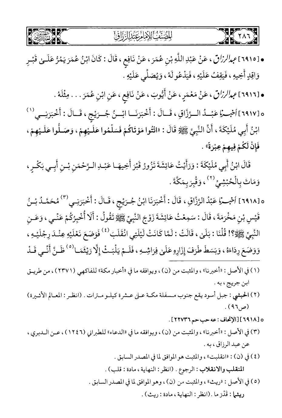° [٦٩١٧] أخبرنا عَبْدُ الرَّزَّاقِ، قَالَ: أَخْبَرَنَا ابْنُ جُرَيْجٍ، قَالَ: أَخْبَرَنِي (¬١) ابْنُ أَبِي مُلَيْكَةَ، أَنَّ النَّبِيَّ - صلى الله عليه وسلم - قَالَ: "ائْتُوا مَوْتَاكُمْ فَسَلِّمُوا عَلَيْهِمْ، وَصَلُّوا عَلَيْهِمْ، فَإِن لَكُمْ فِيهِمْ عِبْرَةً".