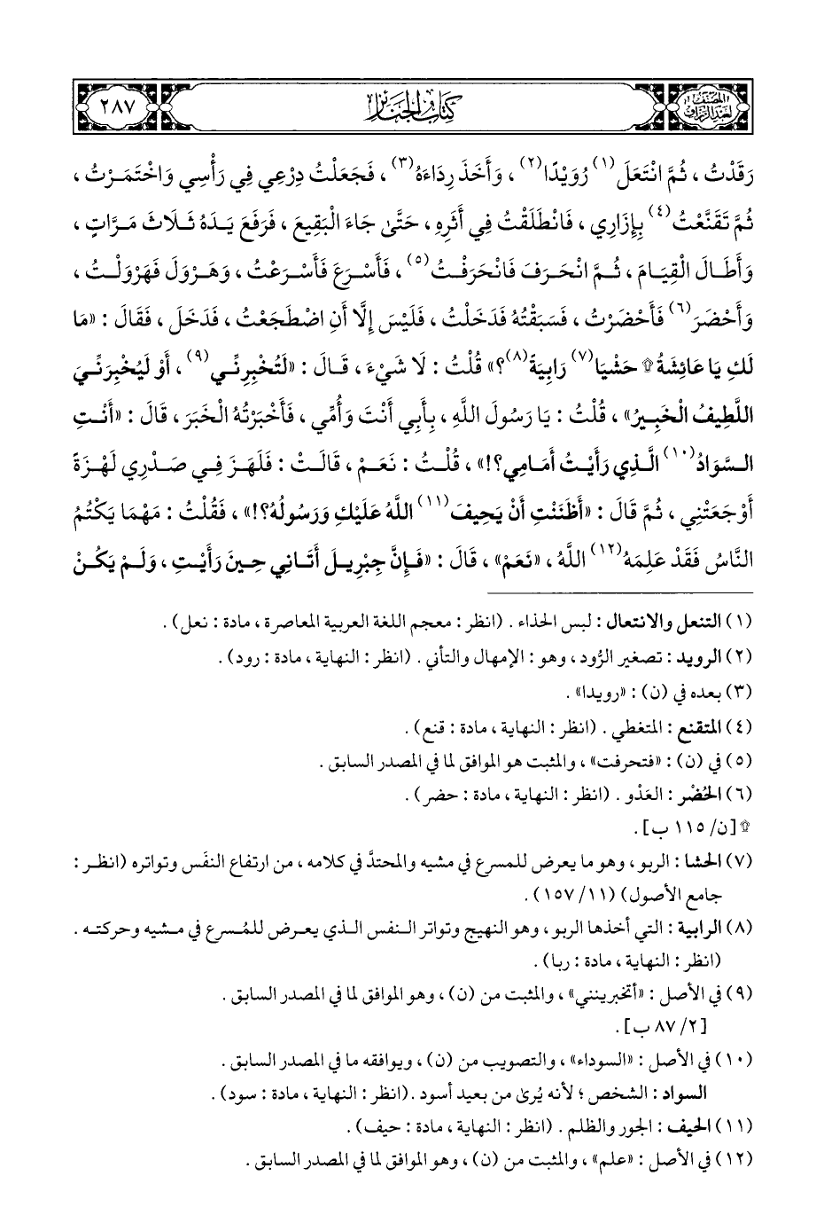 رَقَدْتُ، ثُمَّ انْتَعَلَ (¬١) رُوَيْدًا (¬٢)، وَأَخَذَ رِدَاءَهُ (¬٣)، فَجَعَلْتُ دِرْعِي فِي رَأْسِي وَاخْتَمَرْتُ، ثُمَّ تَمَنَّعْتُ (¬٤) بِإِزَارِي، فَانْطَلَقْتُ فِي أَثَرِهِ، حَتَّى جَاءَ الْبَقِيعَ، فَرَفَعَ يَدَهُ ثَلَاثَ مَرَّاتٍ، وَأَطَالَ الْقِيَامَ، ثُمَّ انْحَرَفَ فَانْحَرَفْتُ (¬٥)، فَأَسْرَعَ فَأَسْرَعْتُ، وَهَرْوَلَ فَهَزْوَلْتُ، وَأَحْضَرَ (¬٦) فَأَحْضَرْتُ، فَسَبَقْتُهُ فَدَخَلْتُ، فَلَيْسَ إِلَّا أَنِ اضْطَجَعْتُ، فَدَخَلَ، فَقَالَ: "مَا لَكِ يَا عَائِشَةُ * حَشْيَا (¬٧) رَابِيَةً (¬٨)؟ " قُلْتُ: لَا شَيْء، قَالَ: "لَتُخْبِرِنِّي (¬٩)، أَوْ لَيُخْبِرَنِّيَ اللَّطِيفُ الْخَبِيرُ"، قُلْتُ: يَا رَسُولَ اللَّهِ، بِأَبِي أَنْتَ وَأُمِّي، فَأَخْبَرْتُهُ الْخَبَرَ، قَالَ: "أَنْتِ السَّوَادُ (¬١٠) الَّذِي رَأَيْتُ أَمَامِيم؟! "، قُلْتُ: نَعَمْ، قَالَتْ: فَلَهَزَ فِي صَدْرِي لَهْزَةً أَوْجَعَتْنِي، ثُمَّ قَالَ: "أَظَنَنْتِ أَنْ يَحِيفَ (¬١١) اللَّهُ عَلَيْكِ وَرَسُولُهُ؟! "، فَقُلْتُ: مَهْمَا يَكْتُمُ النَّاسُ فَقَدْ عَلِمَهُ (¬١٢) اللَّهُ، "نَعَمْ"، قَالَ: "فَإِنَّ جِبْرِيلَ أَتَانِي حِينَ رَأَيْتِ -، وَلَمْ يَكُنْ