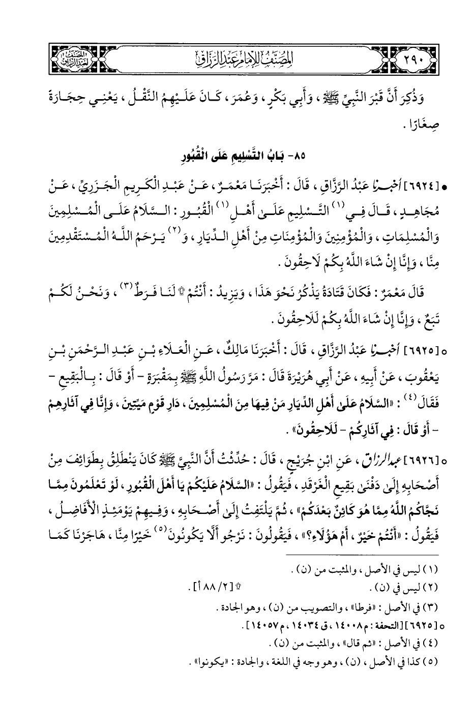 ° [٦٩٢٥] أخبرنا عَبْدُ الرَّزَّاقِ، قَالَ: أَخْبَرَنَا مَالِكٌ، عَنِ الْعَلَاءِ بْنِ عَبْدِ الرَّحْمَنِ بْنِ يَعْقُوبَ، عَنْ أَبِيهِ، عَنْ أَبِي هُرَيْرَةَ قَالَ: مَرَّ رَسُولُ اللَّهِ - صلى الله عليه وسلم - بِمَقْبَرَةٍ - أَوْ قَالَ: بِالْبَقِيعِ - فَقَالَ (¬٤): "السَّلَامُ عَلَى أَهْلِ الدِّيَارِ مَنْ فِيهَا مِنَ الْمُسْلِمِينَ، دَارِ قَوْمٍ مَيَّتِينَ، وَإِنَّا فِي آثَارِهِمْ - أَوْ قَالَ: فِي آثَارَكُمْ - لَلَاحِقُونَ".