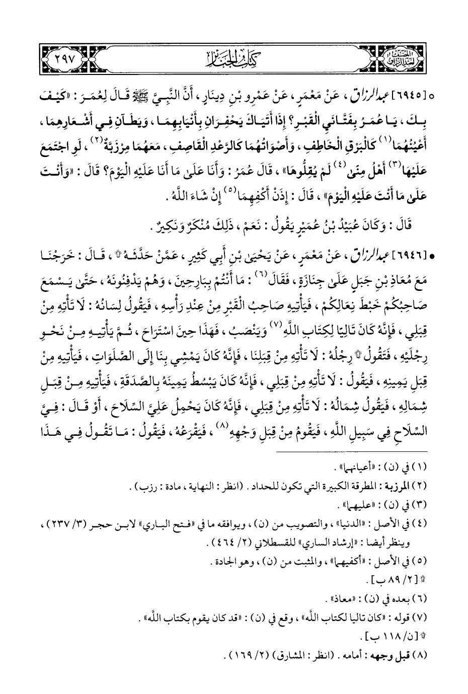 ° [٦٩٤٥] عبد الرزاق، عَنْ مَعْمَرٍ، عَنْ عَمْرِو بْنِ دِينَارِ، أَنَّ النَّبِيَّ - صلى الله عليه وسلم - قَالَ لِعُمَرَ: "كَيْفَ بِكَ، يَا عُمَرُ بِفَتَّانَيِ الْقَبْرِ؟ إِذَا أَتَيَاكَ يَحْفِرَانِ بِأَتيَابِهِمَا، وَيَطَآنِ فِي أَشْعَارِهِمَا، أَعْيُنُهُمَا (¬١) كَالْبَرْقِ الْخَاطِفِ، وَأَصْوَاتُهُمَا كَالرَّعْدِ الْقَاصِفِ، مَعَهُمَا مِرْزَبَّةٌ (¬٢)، لَوِ اجْتَمَعَ عَلَيهَا (¬٣) أَهْلُ مِنًى (¬٤) لَمْ يُقِلُّوهَا"، قَالَ عُمَرُ: وَأَنَا عَلَى مَا أَنَا عَلَيْهِ الْيَوْمَ؟ قَالَ: "وَأَنْتَ عَلَى مَا أَنْتَ عَلَيْهِ الْيَوْمَ"، قَالَ: إِذَنْ أَكْفِهِمَا (¬٥) إِنْ شَاءَ اللَّهُ.