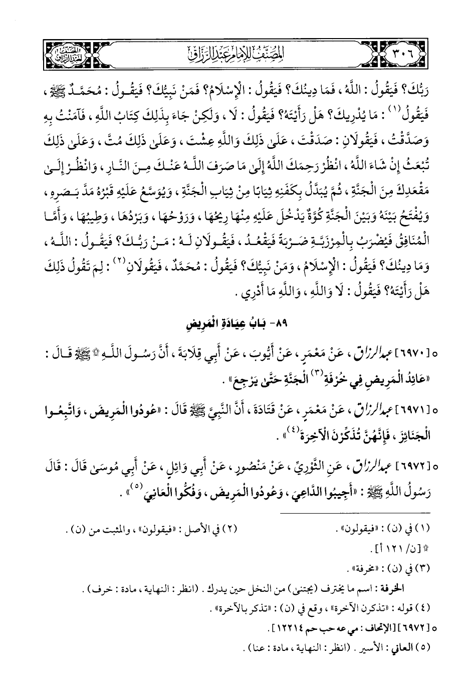 ° [٦٩٧٠] عبد الرزاق، عَنْ مَعْمَرٍ، عَنْ أَيُّوبَ، عَنْ أَبِي قِلَابَةَ، أَنَّ رَسُولَ اللهِ الله - صلى الله عليه وسلم - قَالَ: "عَائِدُ الْمَرِيضِ فِي خُرْفَةِ (¬٣) الْجَنَّةِ حَتَّى يَرْجِعَ".