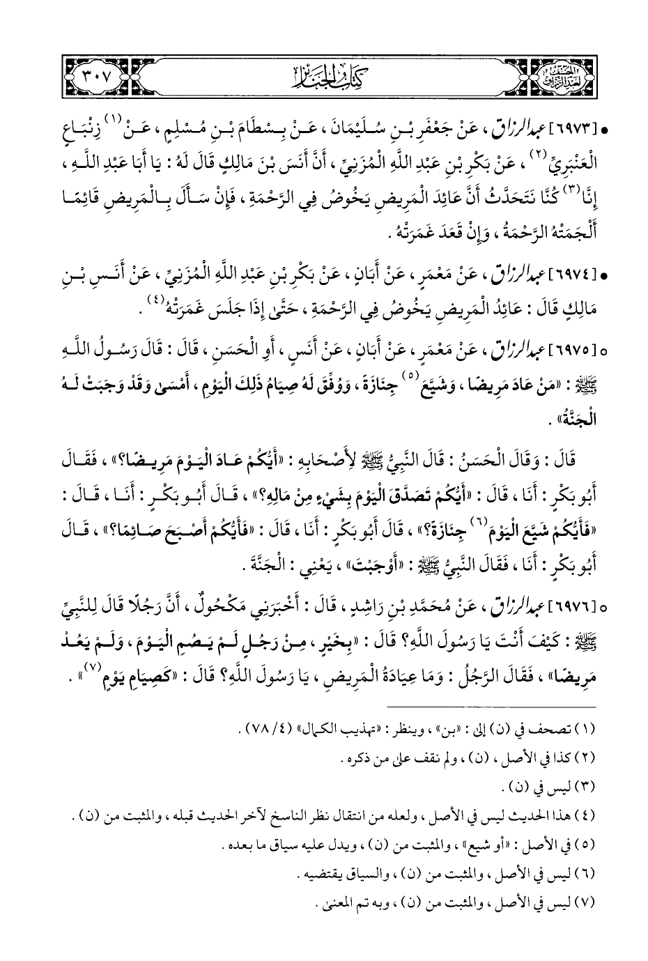 • [٦٩٧٤] عبد الرزاق، عَنْ مَعْمَرٍ، عَنْ أَبَانٍ، عَنْ بَكْرِ بْنِ عَبْدِ اللَّهِ الْمُزَنِيِّ، عَنْ أَنَسِ بْنِ مَالِكٍ قَالَ: عَائِدُ الْمَرِيضِ يَخُوضُ فِي الرَّحْمَةِ، حَتَّى إِذَا جَلَسَ غَمَرَتْهُ (¬٤).