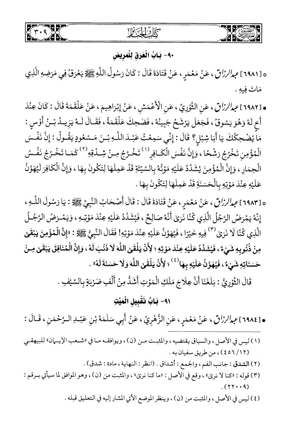° [٦٩٨١] عبد الرزاق، عَنْ مَعْمَرٍ، عَنْ قَتَادَةَ قَالَ: كَانَ رَسُولُ اللَّهِ - صلى الله عليه وسلم - يَعْرَقُ فِي مَرَضِهِ الَّذِي مَاتَ فِيهِ.