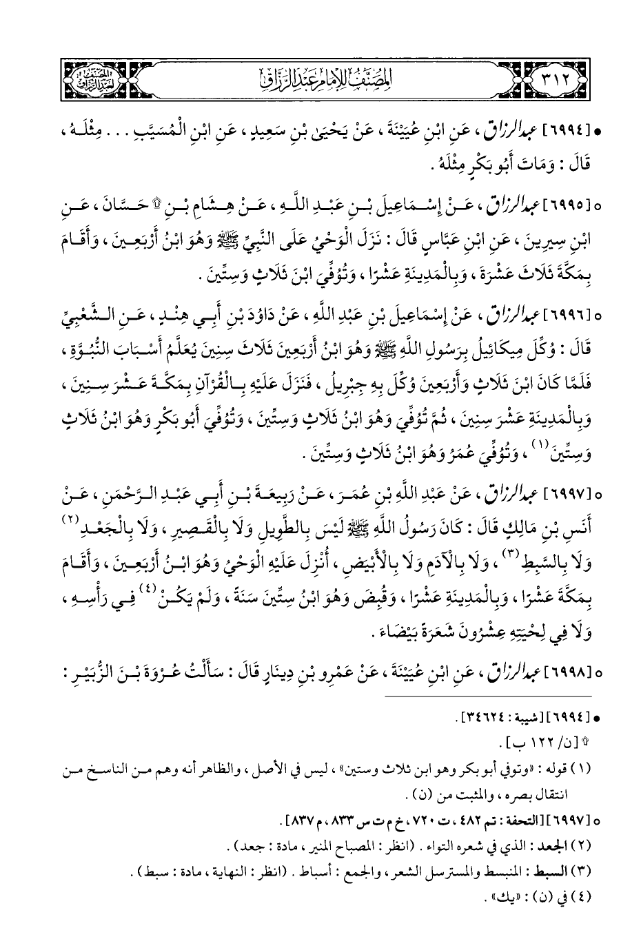 ° [٦٩٩٧] عبد الرزاق، عَنْ عَبْدِ اللهِ بْنِ عُمَرَ، عَنْ رَبِيعَةَ بْنِ أَبِي عَبْدِ الرَّحْمَنِ، عَنْ أَنَسِ بْنِ مَالِكٍ قَالَ: كَانَ رَسُولُ اللَّهِ - صلى الله عليه وسلم - لَيْسَ بِالطَّوِيلِ وَلَا بِالْقَصِيرِ، وَلَا بِالْجَعْدِ (¬٢) وَلَا بِالسَّبِطِ (¬٣)، وَلَا بِالْادَمِ وَلَا بِالْأَبْيضِ، أُنْزِلَ عَلَيْهِ الْوَحْيُ وَهُوَ ابْنُ أَرْبَعِينَ، وَأَقَامَ بِمَكَّةَ عَشْرًا، وَبِالْمَدِينَةِ عَشْرًا، وَقُبِضَ وَهُوَ ابْنُ سِتِّينَ سَنَةَ، وَلَمْ يَكُنْ (¬٤) فِي رَأْسِهِ، وَلَا فِي لِحْيَتِهِ عِشْرُونَ شَعَرَةَ بَيْضَاءَ.