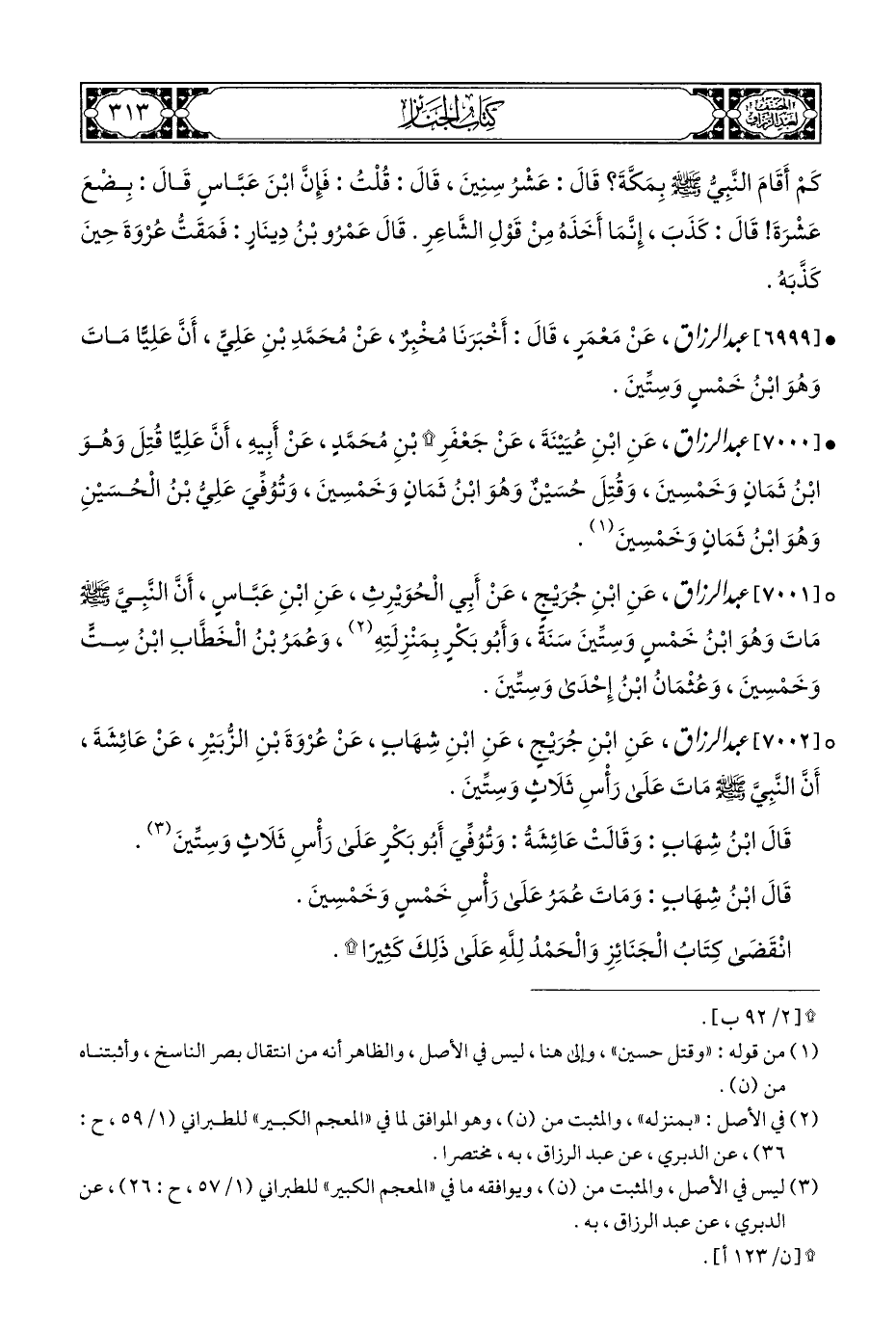 ° [٧٠٠٢] عبد الرزاق، عَنِ ابْنِ جُرَيْجٍ، عَنِ ابْنِ شِهَابٍ، عَنْ عُرْوَةَ بْنِ الزُّبَيْرِ، عَنْ عَائِشَةَ، أَنَّ النَّبِيَّ - صلى الله عليه وسلم - ماتَ عَلَى رَأْسِ ثَلَاثٍ وَسِتِّينَ.