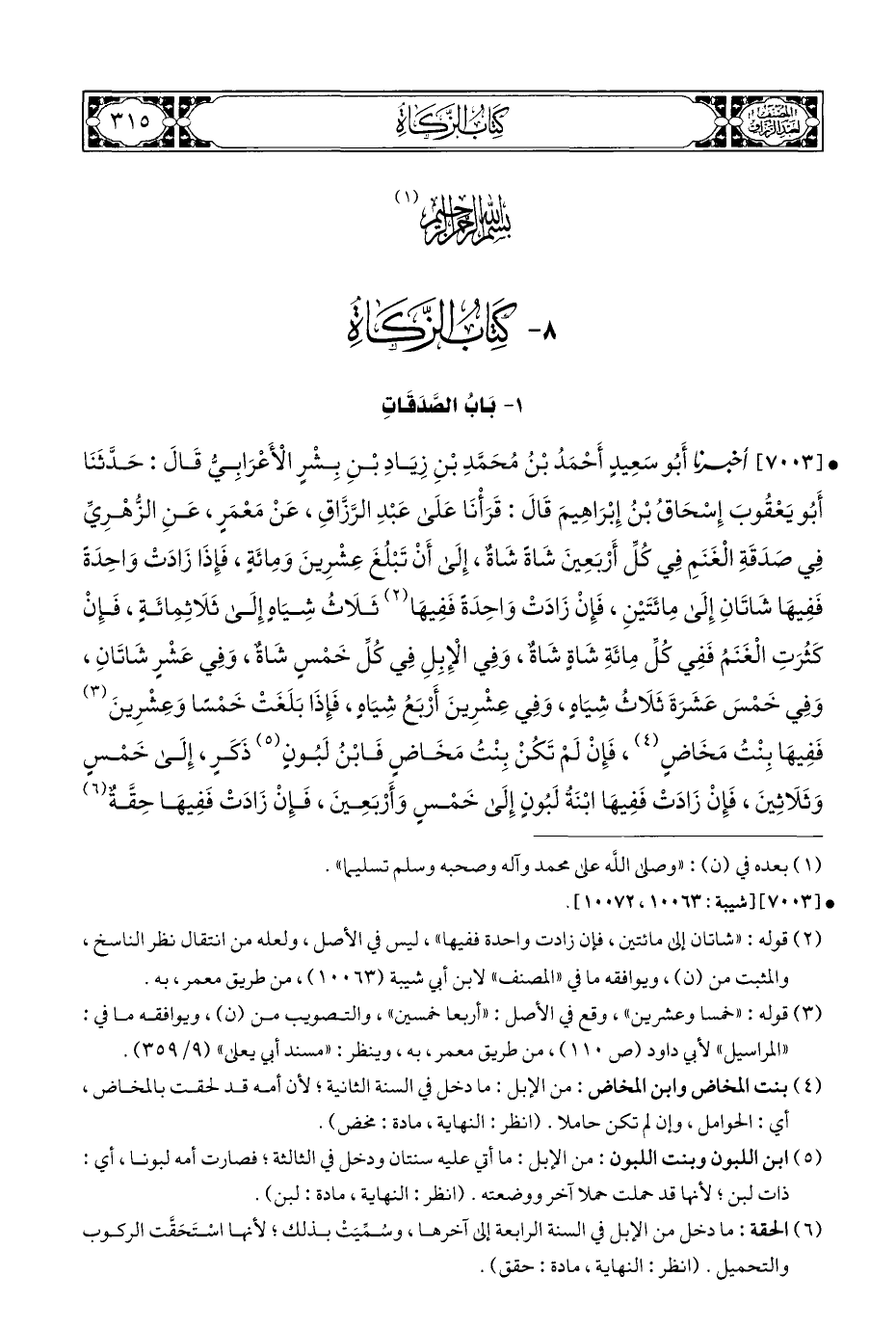 • [٧٠٠٣] أخبرنا أَبُو سَعِيدٍ أَحْمَدُ بْنُ مُحَمَّدِ بْنِ زِيَادِ بْنِ بِشْرٍ الْأَعْرَابِيُّ قَالَ: حَدَّثَنَا أَبُو يَعْقُوبَ إِسْحَاقُ بْنُ إِبْرَاهِيمَ قَالَ: قَرَأْنَا عَلَى عَبْدِ الرَّزَّاقِ، عَنْ مَعْمَرٍ، عَنِ الزُّهْرِيِّ فِي صَدَقَةِ الْغَنَمِ فِي كُلِّ أَرْبَعِينَ شَاةً شَاةٌ، إِلَى أَنْ تَبْلُغَ عِشْرِينَ وَمِائَةٍ، فَإِذَا زَادَتْ وَاحِدَةً فَفِيهَا شَاتَانِ إِلَى مِائَتَيْنِ، فَإِنْ زَادَتْ وَاحِدَةً فَفِيهَا (¬٢) ثَلَاثُ شِيَاهٍ إِلَى ثَلَاثِمِائَةٍ، فَإِنْ كَثُرَتِ الْغَنَمُ فَفِي كُلِّ مِائَةِ شَاةٍ شَاةٌ، وَفِي الْإِبِلِ فِي كُلِّ خَمْسٍ شَاةٌ، وَفِي عَشْرٍ شَاتَانِ، وَفِي خَمْسَ عَشَرَةَ ثَلَاثُ شِيَاهٍ، وَفِي عِشْرِينَ أَرْبَعُ شِيَاهٍ، فَإِذَا بَلَغَتْ خَمْسًا وَعِشْرِينَ (¬٣) فَفِيهَا بِنْتُ مَخَاضٍ (¬٤)، فَإِنْ لَمْ تَكُنْ بِنْتُ مَخَاضٍ فَابْنُ لَبُونٍ (¬٥) ذَكَرٍ، إِلَى خَمْسٍ وَثَلَاثِينَ، فَإِنْ زَادَتْ فَفِيهَا ابْنَةُ لَبُونٍ إِلَى خَمْسٍ وَأَرْبَعِينَ، فَإِنْ زَادَتْ فَفِيهَا حِقَّةٌ (¬٦)