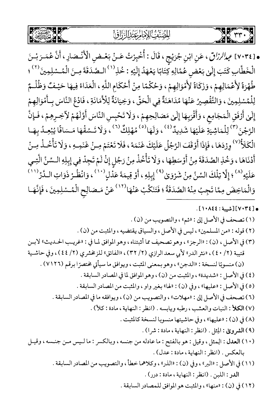 • [٧٠٣٤] عبد الرزاق، عَنِ ابْنِ جُرَيْجٍ، قَالَ: أُخْبِرْتُ عَنْ بَعْضِ الْأَنْصَارِ، أَنَّ عُمَرَ بْنَ الْخَطَّابِ كَتَبَ إِلَى بَعْضِ عُمَّالِهِ كِتَابَا يَعْهَدُ إِلَيْهِ: خُذِ (¬١) الصَّدَقَةَ مِنَ الْمُسْلِمِينَ (¬٢)؛ طُهْرَةً لِأَعْمَالِهِمْ، وَزَكَاةً لِأَمْوَالِهِمْ، وَحُكْمًا مِنْ أَحْكَامِ اللَّهِ، الْعَدَاءُ فِيهَا حَيْفٌ وَظُلْمٌ لِلْمُسْلِمِينَ، وَالتَّقْصِيرُ عَنْهَا مُدَاهَنَةٌ فِي الْحَقِّ، وَخِيَانَةٌ لِلْأَمَانَةِ، فَادْعُ النَّاسَ بِأَمْوَالِهِمْ إِلَى أَرْفَقِ الْمَجَامِعِ، وَأَقْرَبِهَا إِلَى مَصالِحِهِمْ، وَلَا تَحْبِسِ النَّاسَ أَوَّلَهُمْ لآخِرِهِمْ، فَإِنَّ الرَّجْنَ (¬٣) لِلْمَاشِيَةِ عَلَيْهَا شَدِيدٌ (¬٤)، وَلَهَا (¬٥) مُهْلِكٌ (¬٦)، وَلَا تَسُقْهَا مَسَاقًا يُبْعِدُ بِهَا الْكَلأُ (¬٧) وِرْدَهَا، فَإِذَا أَوْقَفَ الرَّجُلُ عَلَيْكَ غَنَمَهُ، فَلَا تَعْتَمْ مِنْ غَنَمِهِ، وَلَا تَأْخُذْ مِنْ أَدْنَاهَا، وَخُذِ الصَّدَقَةَ مِنْ أَوْسَطِهَا، وَلَا تَأْخُذْ مِنْ رَجُلٍ إِنْ لَمْ تَجِدْ فِي إِبِلِهِ السِّنَّ الَّتِي عَلَيْهِ (¬٨)؛ إِلَّا تِلْكَ السِّنَّ مِنْ شَرْوَى (¬٩) إِبِلِهِ، أَوْ قِيمَةَ عَدْلٍ (¬١٠)، وَانْظُرْ ذَوَاتِ الدَّرِّ (¬١١) وَالْمَاخِضَ مِمَّا تَجِبُ مِنْهُ الصَّدَقَةُ؛ فَتَنَكُّبْ عَنْهَا (¬١٢) عَنْ مَصالِحِ الْمُسْلِمِينَ، فَإِنَّهَا