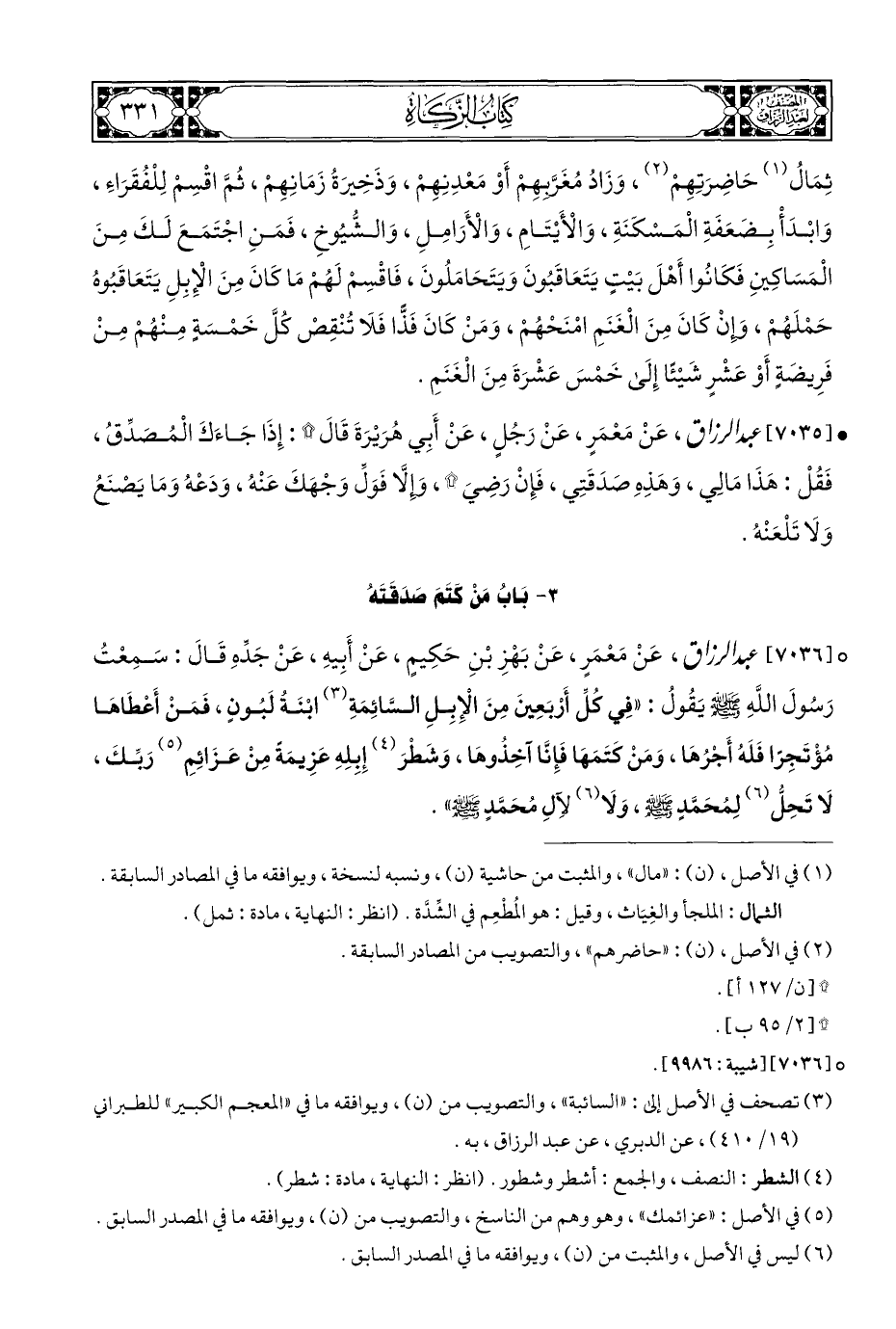 ° [٧٠٣٦] عبد الرزاق، عَنْ مَعْمَرٍ، عَنْ بَهْزِ بْنِ حَكِيمٍ، عَنْ أَبِيهِ، عَنْ جَدِّهِ قَالَ: سَمِعْتُ رَسُولَ اللَّهِ - صلى الله عليه وسلم - يَقُولُ: "فِي كُلِّ أَرْبَعِينَ مِنَ الْإِبِلِ السَّائِمَةِ (¬٣) ابْنَة لَبُونٍ، فَمَنْ أَعْطَاهَا مُؤْتَجِرًا فَلَهُ أَجْرُهَا، وَمَنْ كتَمَهَا فَإِنَّا آخِذُوهَا، وَشَطْرَ (¬٤) إِبِلِهِ عَزِيمَةً مِنْ عَزَائِمِ (¬٥) رَبِّكَ، لَا تَحِلُّ (¬٦) لِمُحَمَّدٍ - صلى الله عليه وسلم -، وَلَا (¬٦) لِآلِ مُحَمَّدٍ - صلى الله عليه وسلم -".
