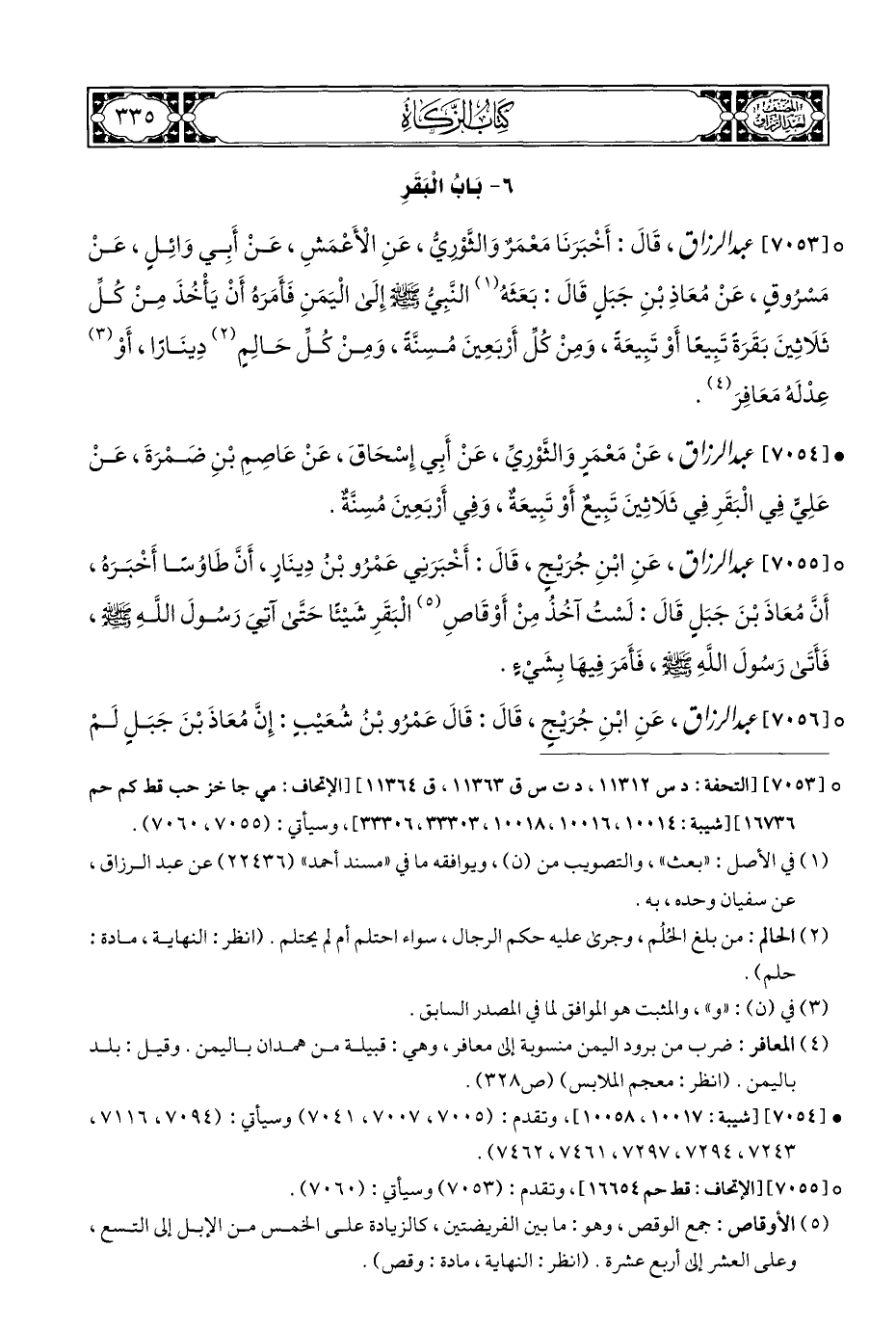 ° [٧٠٥٣] عبد الرزاق، قَالَ: أَخْبَرَنَا مَعْمَرٌ وَالثَّوْرِيُّ، عَنِ الْأَعْمَشِ، عَنْ أَبِي وَائِلٍ، عَنْ مَسْرُوقٍ، عَنْ مُعَاذِ بْنِ جَبَلٍ قَالَ: بَعَثَهُ (¬١) النَّبِيُّ - صلى الله عليه وسلم - إِلَى الْيَمَنِ فَأَمَرَهُ أَنْ يَأْخُذَ مِنْ كُلِّ ثَلَاثِينَ بَقَرَةً تَبِيعًا أَوْ تَبِيعَةً، وَمِنْ كُلِّ أَرْبَعِينَ مُسِنُّةً، وَمِنْ كُلِّ حَالِمٍ (¬٢) دِينَارًا، أَوْ (¬٣) عَدْلَهُ مَعَافِرَ (¬٤).