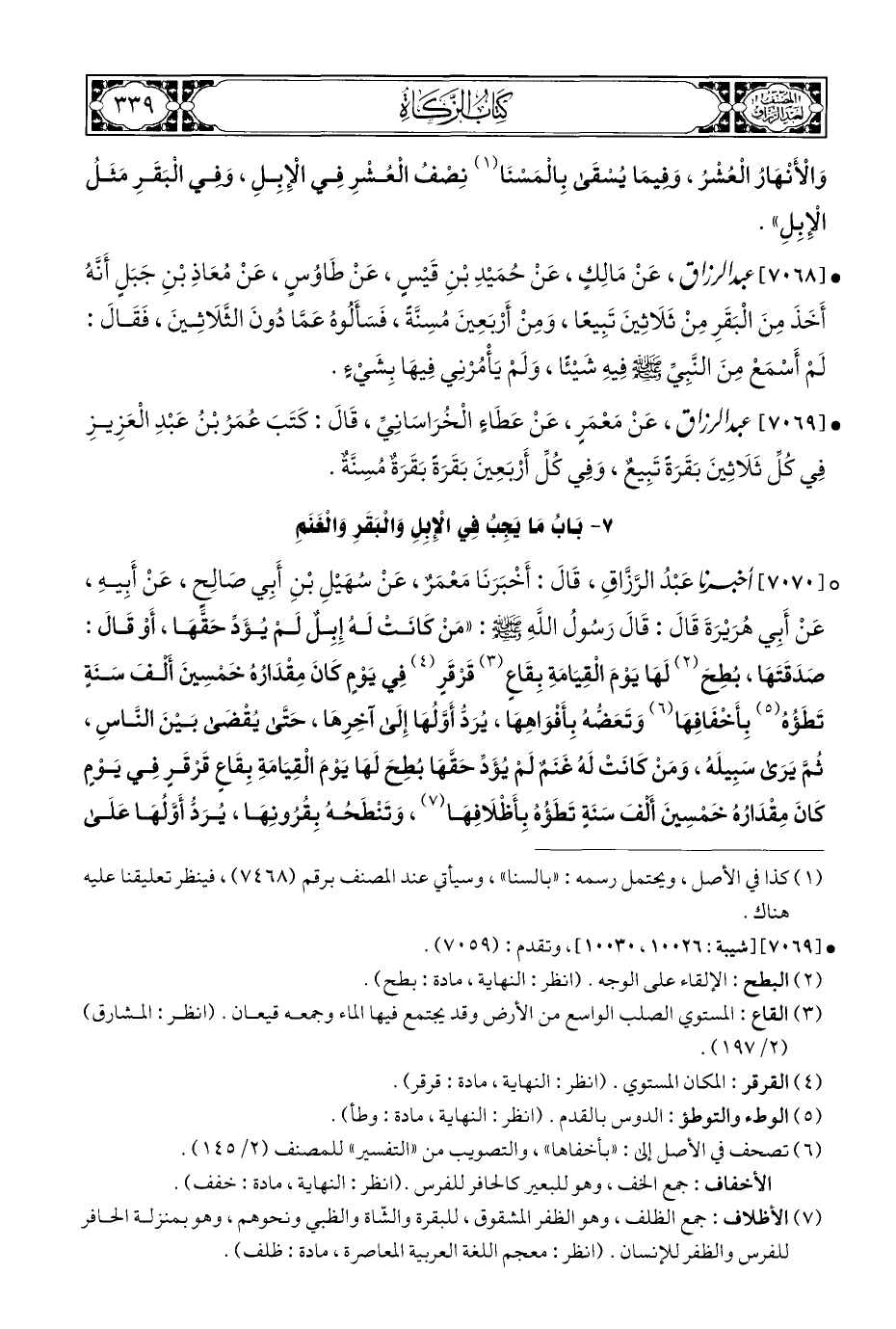 ° [٧٠٧٠] أَخْبَرَنَا عَبْدُ الرَّزَّاقِ، قَالَ: أَخْبَرَنَا مَعْمَرٌ، عَنْ سُهَيْلِ بْنِ أَبِي صالِحٍ، عَنْ أَبِيهِ، عَنْ أَبِي هُرَيْرَةَ قَالَ: قَالَ رَسُولُ اللَّهِ - صلى الله عليه وسلم -: "مَنْ كَانَت لَهُ إِبِلٌ لَمْ يُؤَدِّ حَقَّهَا، أَوْ قَالَ: صَدَقَتَهَا، بُطِحَ (¬٢) لَهَا يَوْمَ الْقِيَامَةِ بِقَاعٍ (¬٣) قَرْقَرٍ (¬٤) فِي يَوْمٍ كَانَ مِقْدَارُهُ خَمْسِينَ أَلْفَ سَنَةٍ تَطَؤُهُ (¬٥) بِأَخْفَافِهَا (¬٦) وَتَعَضُهُ بِأَفْوَاهِهَا، يُرَدُّ أَوَّلُهَا إِلَى آخِرِهَا، حَتَّى يُقْضَى بَيْنَ النَّاسِ، ثُمَّ يَرَى سَبِيلَهُ، وَمَنْ كَانَتْ لَهُ غَنَمٌ لَمْ يُؤَدِّ حَقِّهَا بُطِحَ لَهَا يَوْمَ الْقِيَامَةِ بِقَاعٍ قَرْقَرٍ فِي يَوْم كَانَ مِقْدَارُهُ خَمْسِينَ أَلْفَ سَنَةٍ تَطَؤُهُ بِأَظْلَافِهَا (¬٧)، وَتَنْطَحُهُ بِقُرُونِهَا، يُرَدُّ أَوَّلُهَا عَلَى