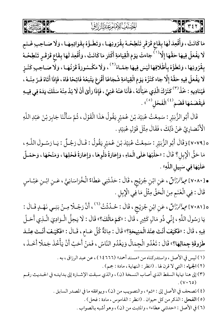 ° [٧٠٧٩] عبد الرزاق، وَقَالَ أَبُو الزُّبَيْرِ: سَمِعْتُ عُبَيْدَ بْنَ عُمَيْرٍ يَقُولُ: قَالَ رَجُلٌ: يَا رَسُولَ اللَّهِ، مَا حَقُّ الْإِبِلِ؟ قَالَ: "حَلْبُهَا عَلَى الْمَاءِ، وَإِعَارَةُ دَلْوِهَا، وَإِعَارَةُ فَحْلِهَا، وَمَنْحُهَا، وَحَمْلٌ عَلَيْهَا فِي سَبِيلِ اللَّهِ".