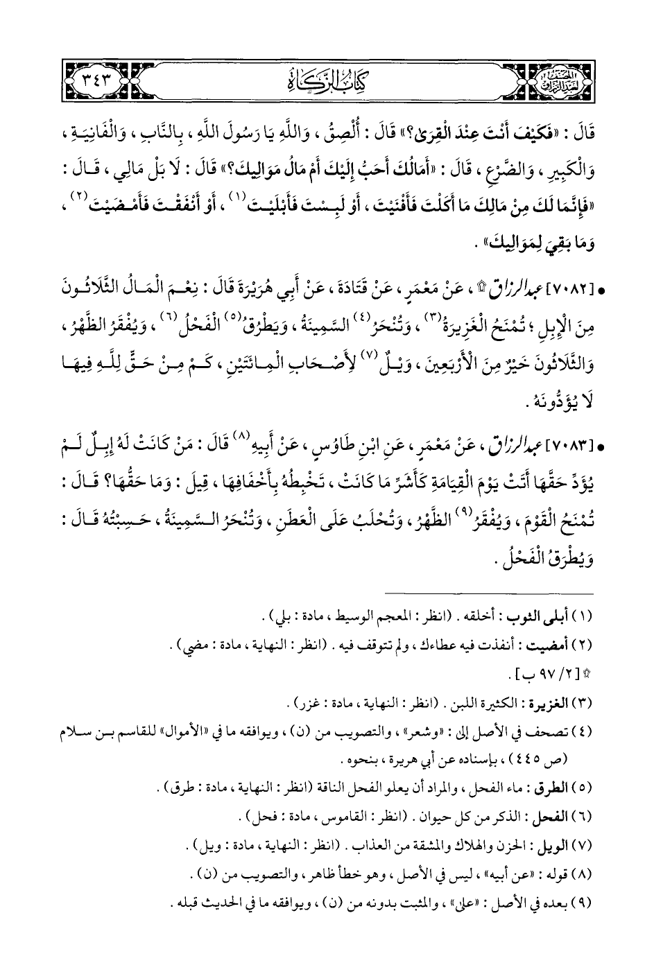 • [٧٠٨٢] عبد الرزاق *، عَنْ مَعْمَرٍ، عَنْ قَتَادَةَ، عَنْ أَبِي هُرَيْرَةَ قَالَ: نِعْمَ الْمَالُ الثَّلَاثُونَ مِنَ الْإِبِلِ؛ تُمْنَحُ الْغَزِيرَةُ (¬٣)، وَتُنْحَرُ (¬٤) السَّمِينَةُ، وَيَطْرُقُ (¬٥) الْفَحْلُ (¬٦)، وَيُفْقَرُ الظَّهْرُ، وَالثَّلَاثُونَ خَيْرٌ مِنَ الْأَرْبَعِينَ، وَيْلٌ (¬٧) لِأَصْحَابِ الْمِائَتَيْنِ، كَمْ مِنْ حَقٍّ لِلَّهِ فِيهَا لَا يُؤَدُّونَهُ.