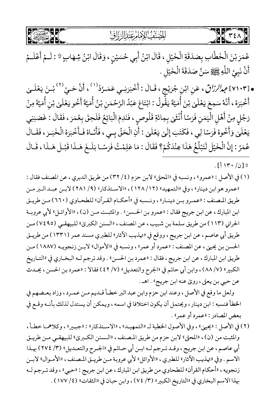 (¬١) في الأصل: "عمرو"، ونسبه في "المحلى" لابن حزم (٤/ ٣٢) من طريق الدبري، عن المصنف فقال: "عمرو هو ابن دينار"، وفي "التمهيد" (١٢/ ١٢٨)، "الاستذكار" (٩/ ٢٨١) لابن عبد البر من طريق المصنف: "عمرو بن دينار"، ونسبه في "أحكام القرآن" للطحاوي (٦٦٠) من طريق ابن المبارك، عن ابن جريج فقال: "عمرو بن الحسن". والمثبت من (ن)، "الأوائل" لأبي عروبة الحراني (١١٣) من طريق سلمة بن شبيب، عن المصنف، "السنن الكبرى" للبيهقي (٧٤٩٥) من طريق أبي عاصم، عن ابن جريج، ووقع في "تهذيب الآثار" للطبري مسند عمر (١٣٣١) من طريق الحسن بن يحيى، عن المصنف: "عمرد أو عمر"، ونسبه في "الأموال" لابن زنجويه (١٨٨٧) من طريق ابن المبارك، عن ابن جريج، فقال: "عمرد بن الحسن". وقد ترجم له البخاري في "التاريخ الكبير" (٧/ ٨٨)، وابن أبي حاتم في "الجرح والتعديل" (٧/ ٤٢) فقالا: "عمرد بن الحسن، يحدث عن حيي بن يعلى، روى عنه ابن جريج". اهـ.