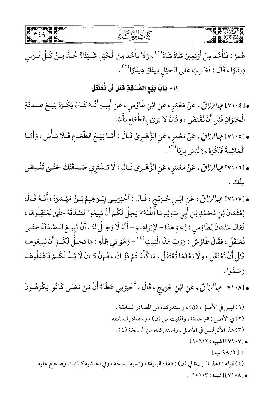 • [٧١٠٧] عبد الرزاق، عَنِ ابْنِ جُرَيْجٍ، قَالَ: أَخْبَرَنِي إِبْرَاهِيمُ بْنُ مَيْسَرَةَ، أَنَّهُ قَالَ لِعُثْمَانَ بْنِ مُحَمَّدِ بْنِ أَبِي سُوَيْدٍ مَا أُظُنُّهُ * يَحِلُّ لَكُمْ أَنْ تَبِيعُوا الصَّدَقَةَ حَتَّى تَعْتَقِلُوهَا، فَقَالَ عُثْمَانُ لِطَاوُسٍ: زَعَمَ هَذَا - لإِبْرَاهِيمَ - أَنَّهُ لَا يَحِلُّ لَنَا أَنْ نَبِيعَ الصَّدَقَةَ حَتَّى تُعْتَقَلَ، فَقَالَ طَاوُسٌ: وَرَبِّ هَذَا الْبَيْتِ (¬٤) - وَهُوَ فِي ظِلِّهِ: مَا يَحِلُّ لكمْ أَنْ تَبِيعُوهَا قَبْلَ أَنْ تُعْتَقَلَ، وَلَا بَعْدَمَا تُعْتَقَلُ، مَا كُلِّفْتُمْ ذَلِكَ، فَإِنْ كَانَ لَا بُدَّ لكمْ فَاعْقِلُوهَا وَسَمُّوا.