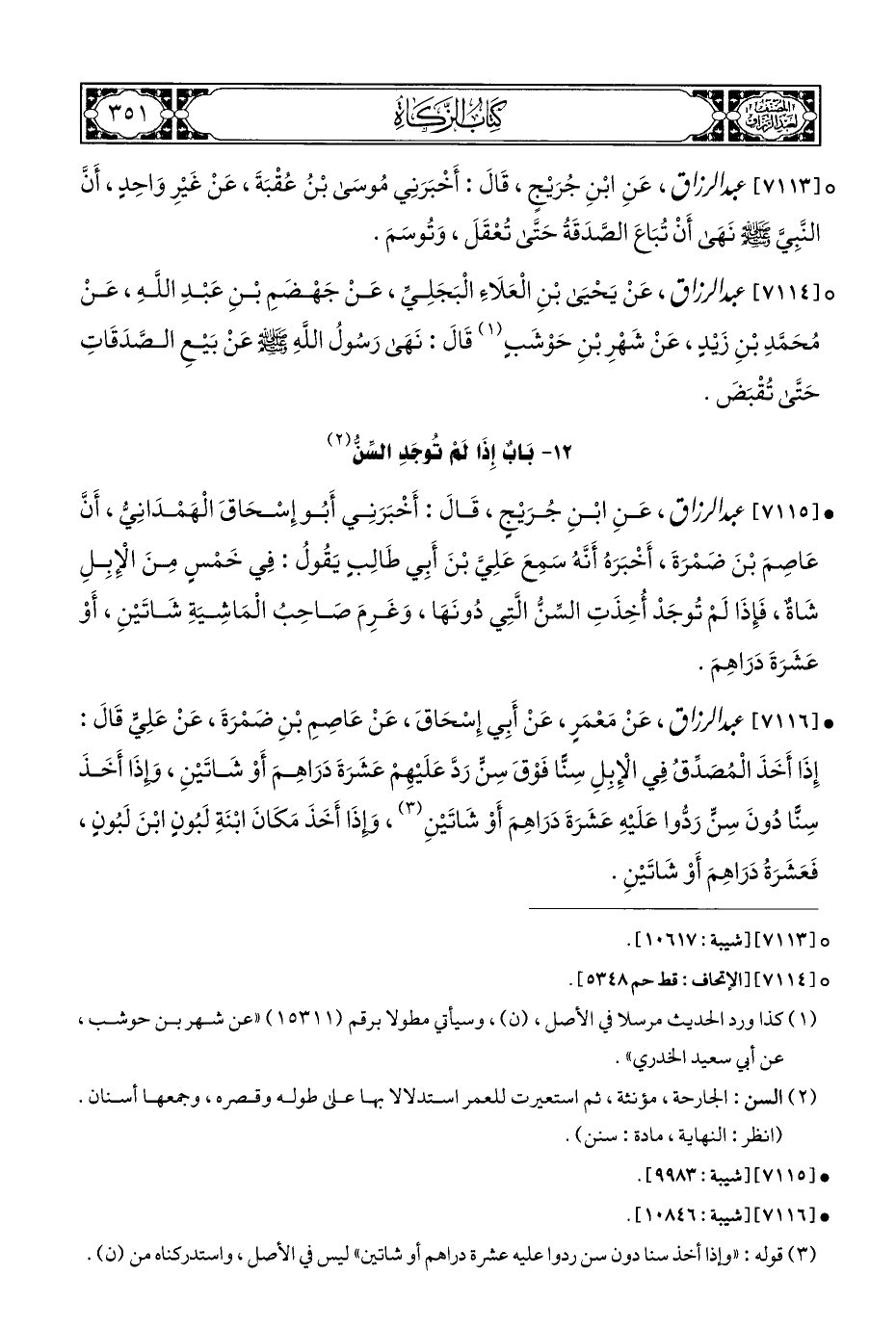 ° [٧١١٣] عبد الرزاق، عَنِ ابْنِ جُرَيْجٍ، قَالَ: أَخْبَرَنِي مُوسَى بْنُ عُقْبَةَ، عَنْ غَيْرِ وَاحِدٍ، أَنَّ النَّبِيَّ - صلى الله عليه وسلم - نهَى أَنْ تُبَاعَ الصدَقَةُ حَتَّى تُعْقَلَ، وَتُوسَمَ.