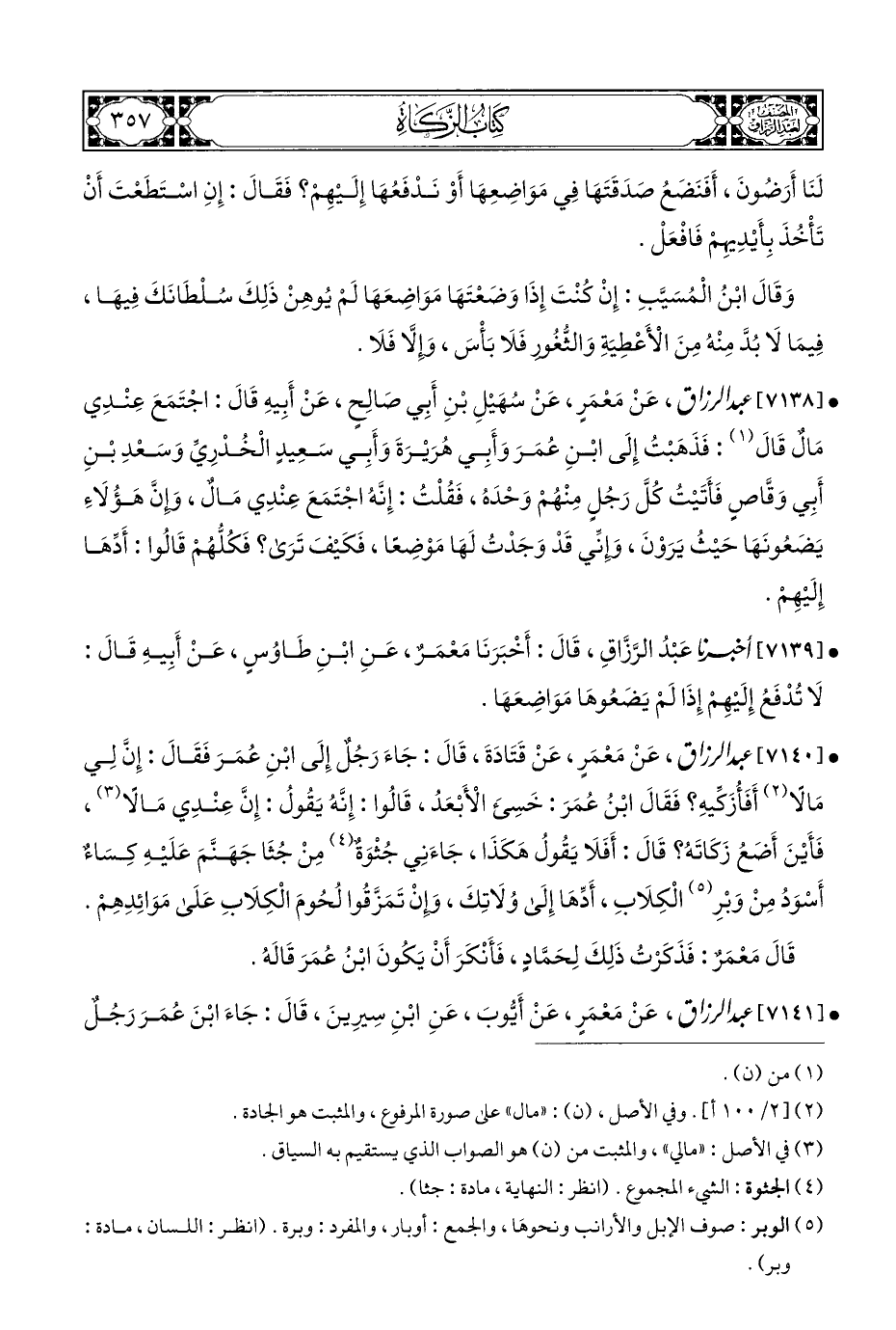 • [٧١٣٨] عبد الرزاق، عَنْ مَعْمَرٍ، عَنْ سُهَيْلِ بْنِ أَبِي صَالِحٍ، عَنْ أَبِيهِ قَالَ: اجْتَمَعَ عِنْدِي مَالى قَالَ (¬١): فَذَهَبْتُ إِلَى ابْنِ عُمَرَ وَأَبِي هُرَيْرَةَ وَأَبِي سَعِيدٍ الْخُدْرِيِّ وَسَعْدِ بْنِ أَبِي وَقَّاصٍ فَأَتَيْتُ كُلَّ رَجُلٍ مِنْهُمْ وَحْدَهُ، فَقُلْتُ: إِنَّهُ اجْتَمَعَ عَنْدِي مَالٌ، وإِنَّ هَؤُلَاءِ يَضَعُونَهَا حَيْثُ يَرَوْنَ، وإِنِّي قَدْ وَجَدْتُ لَهَا مَوْضِعًا، فَكَيْفَ تَرَى؟ فَكُلُّهُمْ قَالُوا: أَدِّهَا إِلَيْهِمْ.