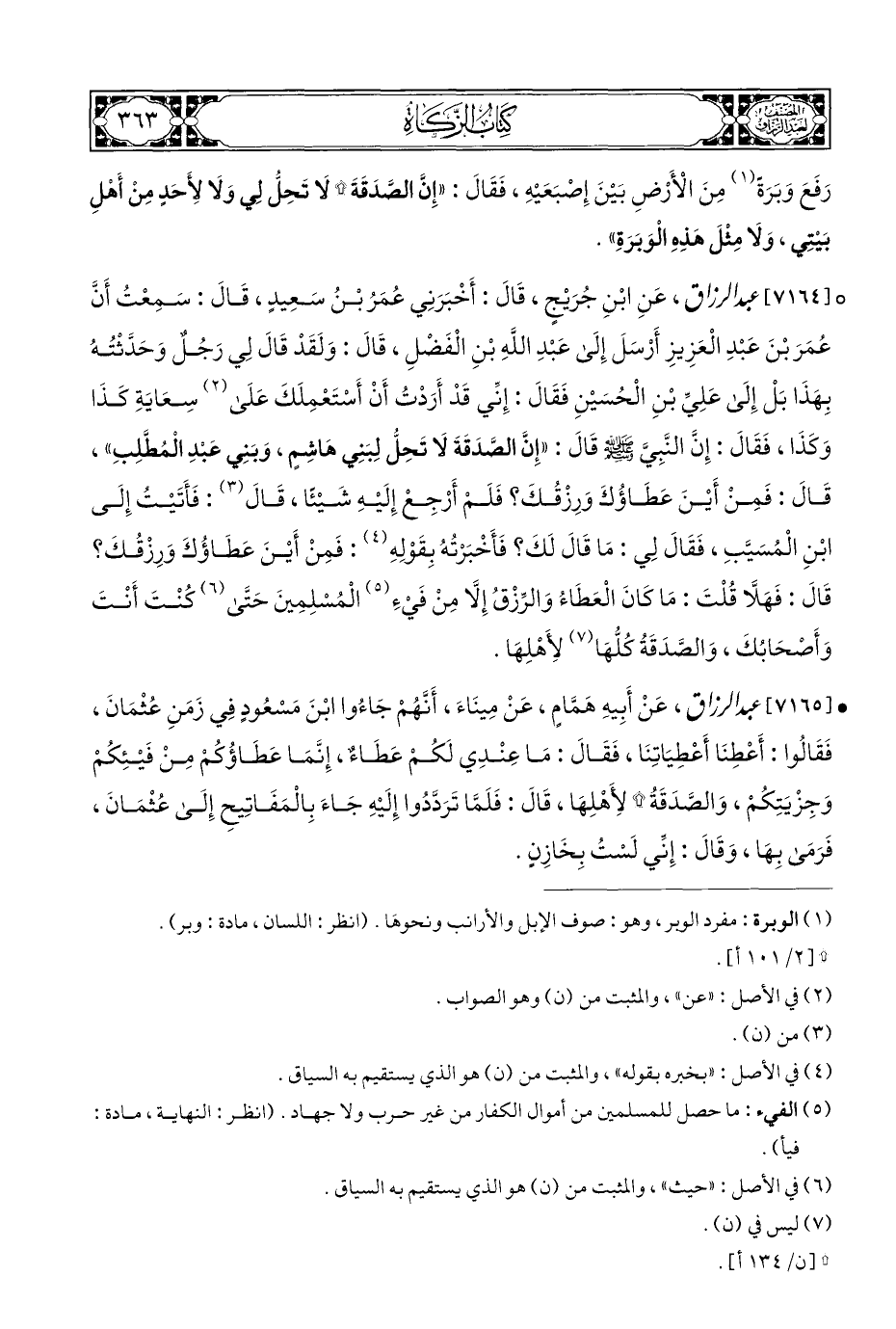 ° [٧١٦٤] عبد الرزاق، عَنِ ابْنِ جُرَيْجٍ، قَالَ: أَخْبَرَنِي عُمَرُ بْنُ سَعِيدٍ، قَالَ: سَمِعْتُ أَنَّ عُمَرَ بْنَ عَبْدِ الْعَزِيزِ أَرْسَلَ إِلَى عَبْدِ اللَّهِ بْنِ الْفَضْلِ، قَالَ: وَلَقَدْ قَالَ لِي رَجُلٌ وَحَدَّثْتُهُ بِهَذَا بَلْ إِلَى عَلِيِّ بْنِ الْحُسَيْنِ فَقَالَ: إِنِّي قَدْ أَرَدْتُ أَنْ أَسْتَعْمِلَكَ عَلَى (¬٢) سِعَايَةِ كَذَا وَكَذَا، فَقَالَ: إِنَّ النَّبِيَّ - صلى الله عليه وسلم - قَالَ: "إِنَّ الصَّدَقَةَ لَا تَحِلُّ لِبَنِي هَاشِمٍ، وَبَنِي عَبدِ الْمُطَّلِبِ"، قَالَ: فَمِنْ أَيْنَ عَطَاؤُكَ وَرِزْقُكَ؟ فَلَمْ أَرْجِعْ إِلَيْهِ شَيْئًا، قَالَ (¬٣): فَأَتَيْتُ إِلَى ائنِ الْمُسَيَّبِ، فَقَالَ لِي: مَا قَالَ لَكَ؟ فَأَخْبَرْتُهُ بِقَوْلِهِ (¬٤): فَمِنْ أَيْنَ عَطَاؤُكَ وَرِزْقُكَ؟ قَالَ: فَهَلَّا قُلْتَ: مَا كَانَ الْعَطَاءُ وَالرِّزْقُ إِلَّا مِنْ فَيءِ (¬٥) الْمُسْلِمِينَ حَتَّى (¬٦) كُنْتَ أَنْتَ وَأَصْحَابُكَ، وَالصَّدَقَةُ كُلُّهَا (¬٧) لِأَهْلِهَا.