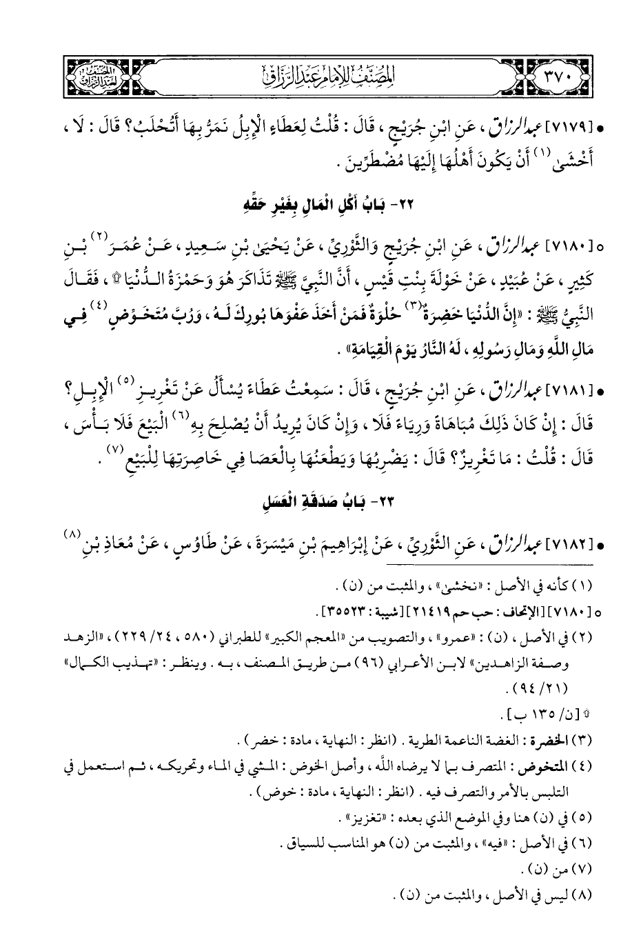 ° [٧١٨٠] عبد الرزاق، عَنِ ابْنِ جُرَيْجٍ وَالثَّوْرِيِّ، عَنْ يَحْيَى بْنِ سَعِيدٍ، عَنْ عُمَرَ (¬٢) بْنِ كَثِيرٍ، عَنْ عُبَيْدٍ، عَنْ خَوْلَةَ بِنْتِ قَيْسٍ، أَنَّ النَّبِيَّ - صلى الله عليه وسلم - تَذَاكَرَ هُوَ وَحَمْزَةُ الدُّنْيَا *، فَقَالَ النَّبِيُّ - صلى الله عليه وسلم -: "إِنَّ الدُّنْيَا خَضِرَةٌ (¬٣) حُلْوَةٌ فَمَنْ أَخَذَ عَفْوَهَا بُورِكَ لَهُ، وَرُبَّ مُتَخَوِّضٍ (¬٤) فِي مَالِ اللَّهِ وَمَالِ رَسُولِهِ، لَهُ النَّارُ يَوْمَ الْقِيَامَةِ".
