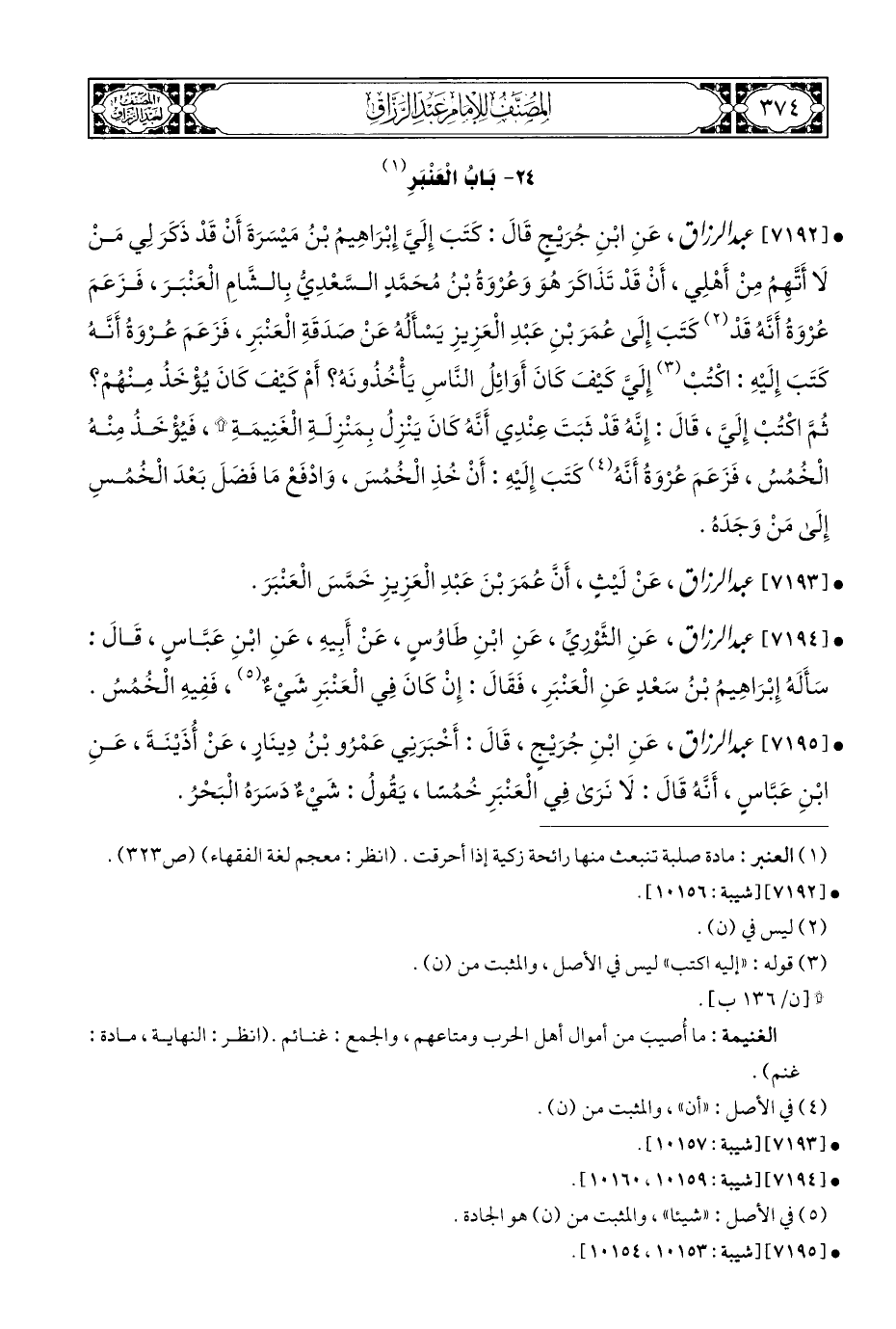 • [٧١٩٢] عبد الرزاق، عَنِ ابْنِ جُرَيْجٍ قَالَ: كَتَبَ إِلَيَّ إِبْرَاهِيمُ بْنُ مَيْسَرَةَ أَنْ قَدْ ذَكَرَ لِي مَنْ لَا أَتَّهِمُ مِنْ أَهْلِي، أَنْ قَدْ تَذَاكَرَ هُوَ وَعُرْوَةُ بْنُ مُحَمَّدٍ السَّعْدِيُّ بِالشَّامِ الْعَنْبَرَ، فَزَعَمَ عُرْوَةُ أَنَّهُ قَدْ (¬٢) كَتَبَ إِلَى عُمَرَ بْنِ عَبْدِ الْعَزِيزِ يَسْأَلُهُ عَنْ صَدَقَةِ الْعَنْبَرِ، فَزَعَمَ عُرْوَةُ أَنَّهُ كَتَبَ إِلَيْهِ: اكْتُبْ (¬٣) إِلَيَّ كَيْفَ كَانَ أَوَائِلُ النَّاسِ يَأْخُذُونَهُ؟ أَمْ كَيْفَ كَانَ يُؤْخَذُ مِنْهُمْ؟ ثُمَّ اكْتُبْ إِلَيَّ، قَالَ: إِنَّهُ قَدْ ثَبَتَ عِنْدِي أَنَّهُ كَانَ يَنْزِلُ بِمَنْزِلَةِ الْغَنِيمَةِ *، فَيُؤْخَذُ مِنْهُ الْخُمُسُ، فَزَعَمَ عُرْوَةُ أَنَّهُ (¬٤) كَتَبَ إِلَيْهِ: أَنْ خُذِ الْخُمُسَ، وَادْفَعْ مَا فَضَلَ بَعْدَ الْخُمُسِ إلَى مَنْ وَجَدَهُ.
