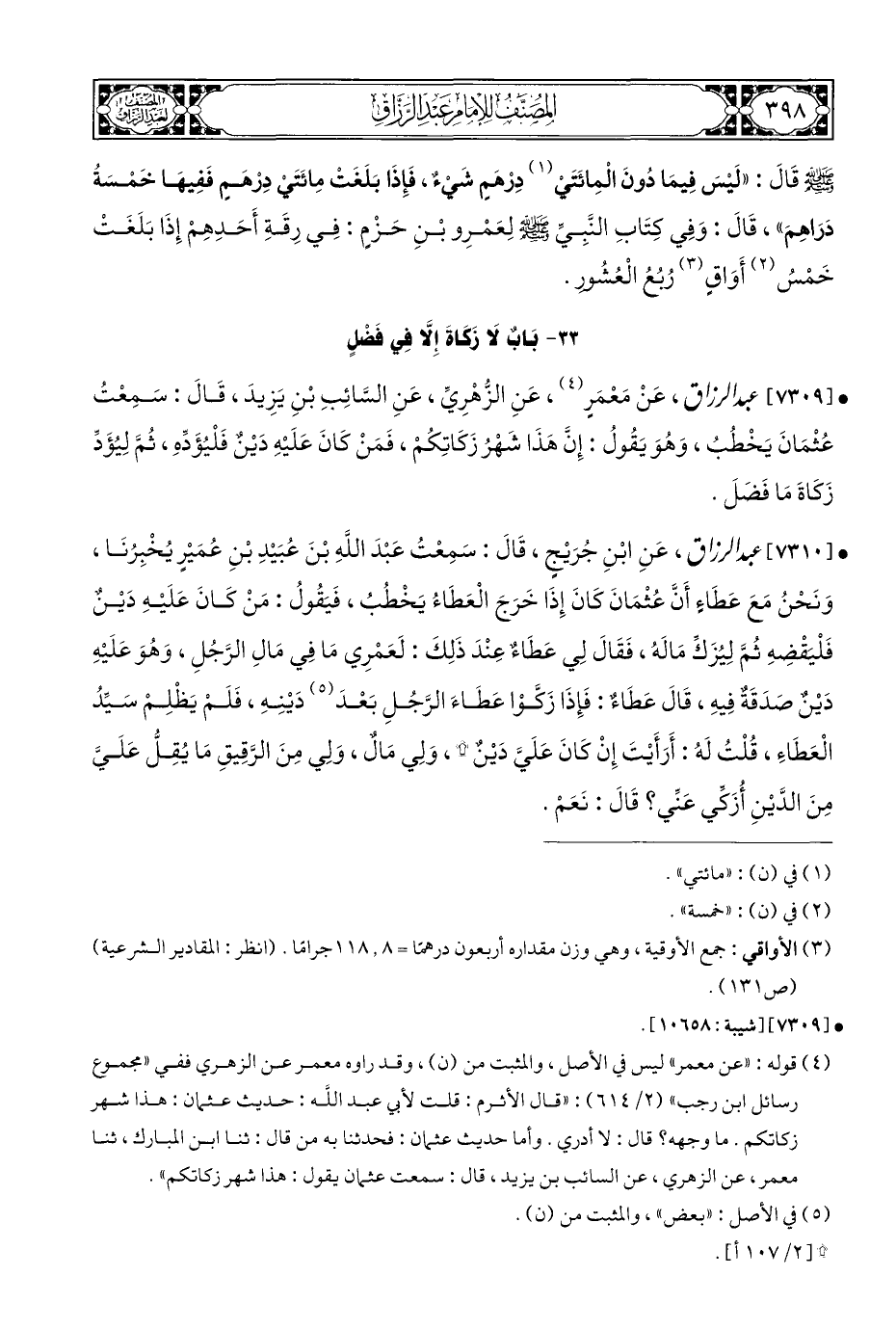 (¬٤) قوله: "عن معمر" ليس في الأصل، والمثبت من (ن)، وقد راوه معمر عن الزُّهري ففي "مجموع رسائل ابن رجب" (٢/ ٦١٤): "قال الأثرم: قلت لأبي عبد الله: حديث عثمان: هذا شهر زكاتكم. ما وجهه؟ قال: لا أدري. وأما حديث عثمان: فحدثنا به من قال: ثنا ابن المبارك، ثنا معمر، عن الزُّهري، عن السائب بن يزيد، قال: سمعت عثمان يقول: هذا شهر زكاتكم".