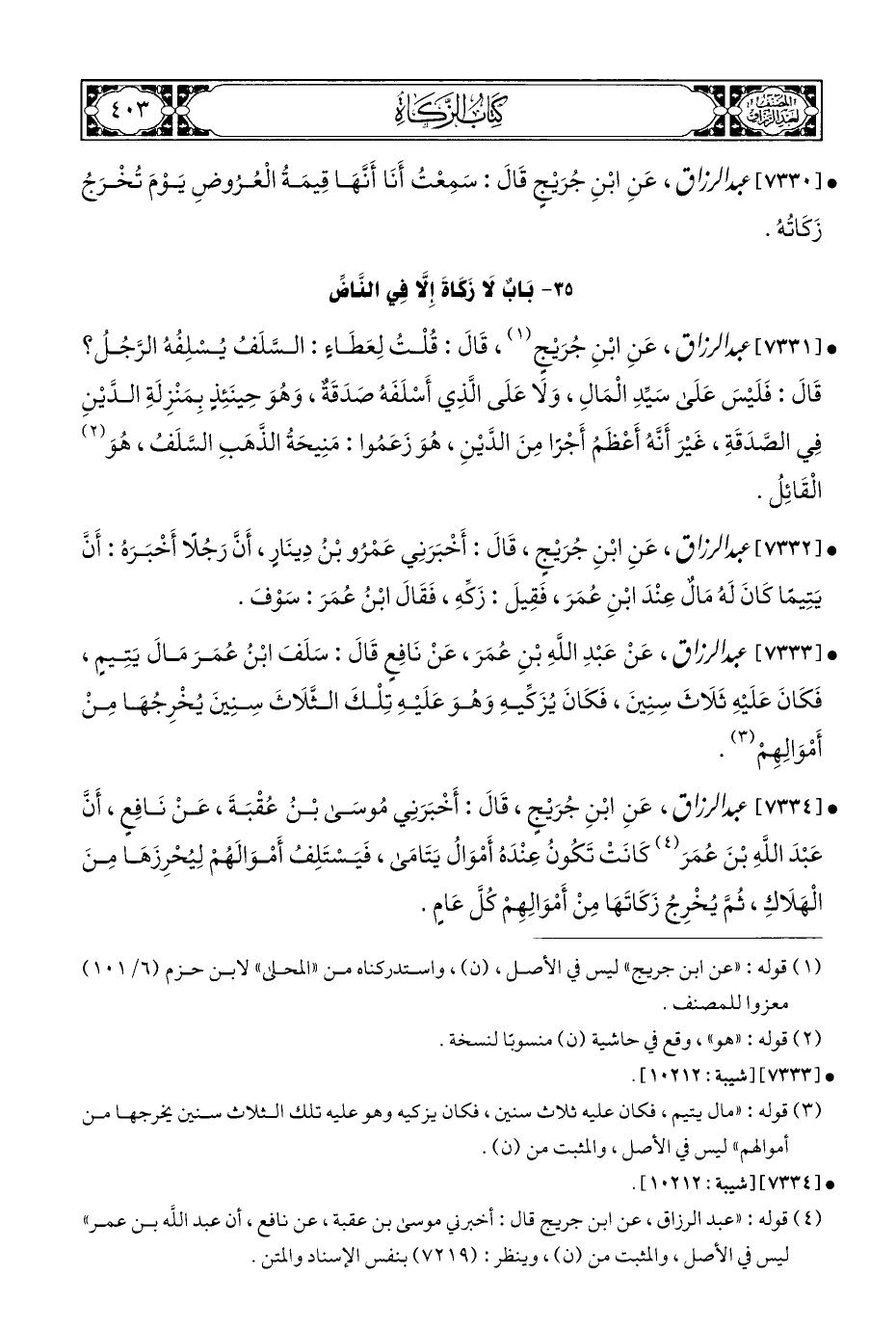 • [٧٣٣٣] عبد الرزاق، عَنْ عَبْدِ اللَّهِ بْنِ عُمَرَ، عَنْ نَافِعٍ قَالَ: سَلَفَ ابْنُ عُمَرَ مَالَ يَتِيمٍ، فَكَانَ عَلَيْهِ ثَلَاثَ سِنِينَ، فَكَانَ يُزَكِّيهِ وَهُوَ عَلَيْهِ تِلْكَ الثَّلَاثَ سِنِينَ يُخْرِجُهَا مِنْ أَمْوَالِهِمْ (¬٣).