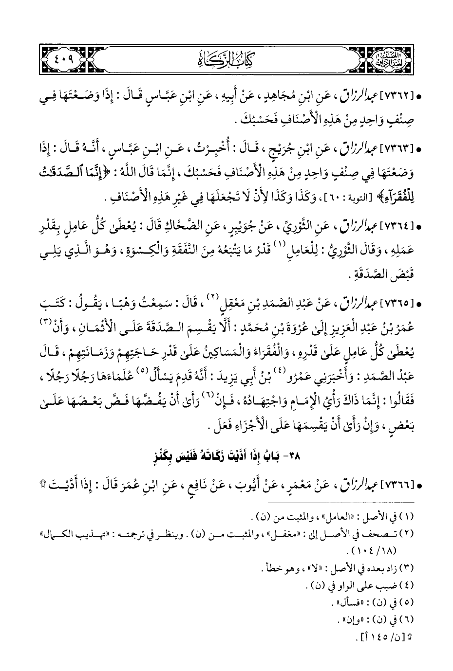 • [٧٣٦٥] عبد الرزاق، عَنْ عَبْدِ الصَّمَدِ بْنِ مَعْقِلٍ (¬٢)، قَالَ: سَمِعْتُ وَهْبًا، يَقُولُ: كَتَبَ عُمَرُ بْنُ عَبْدِ الْعَزِيزِ إِلَى عُرْوَةَ بْنِ مُحَمَّدٍ: أَلَّا يَقْسِمَ الصَّدَقَةَ عَلَى الْأَثْمَانِ، وَأَنْ (¬٣) يُعْطَى كُلُّ عَامِلٍ عَلَى قَدْرِهِ، وَالْفُقَرَاءُ وَالْمَسَاكِينُ عَلَى قَدْرِ حَاجَتِهِمْ وَزَمَانَتِهِمْ، قَالَ عَبْدُ الصَّمَدِ: وَأَخبَرَنِي عَمْرُو (¬٤) بْنُ أَبِي يَزِيدَ: أَنَّهُ قَدِمَ يَسْأَلُ (¬٥) عُلَمَاءَهَا رَجُلًا رَجُلًا، فَقَالُوا: إِنَّمَا ذَاكَ رَأْيُ الْإِمَامِ وَاجْتِهَادُهُ، فَإِنْ (¬٦) رَأَى أَنْ يَفُضَّهَا فَضَّ بَعْضَهَا عَلَى بَعْضٍ، وإِنْ رَأَى أَنْ يَقْسِمَهَا عَلَى الْأَجْزَاءِ فَعَلَ.