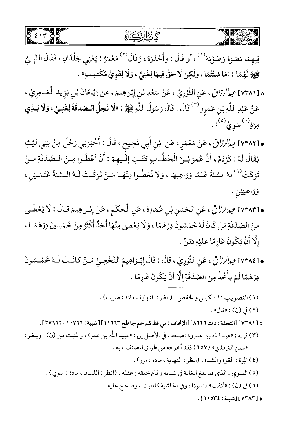 ° [٧٣٨١] عبد الرزاق، عَنِ الثَّوْرِيِّ، عَنْ سَعْدِ بْنِ إِبْرَاهِيمَ، عَنْ رَيْحَانَ بْنِ يَزِيدَ الْعَامِرِيِّ، عَنْ عَبْدِ اللَّهِ بْنِ عَمْرٍو (¬٣) قَالَ: قَالَ رَسُولُ اللَّهِ - صلى الله عليه وسلم -: "لَا تَحِلُّ الصَّدَقَةُ لِغَنِيٍّ، وَلَا لِذِي مِرَّةٍ (¬٤) سَوِيٍّ (¬٥).