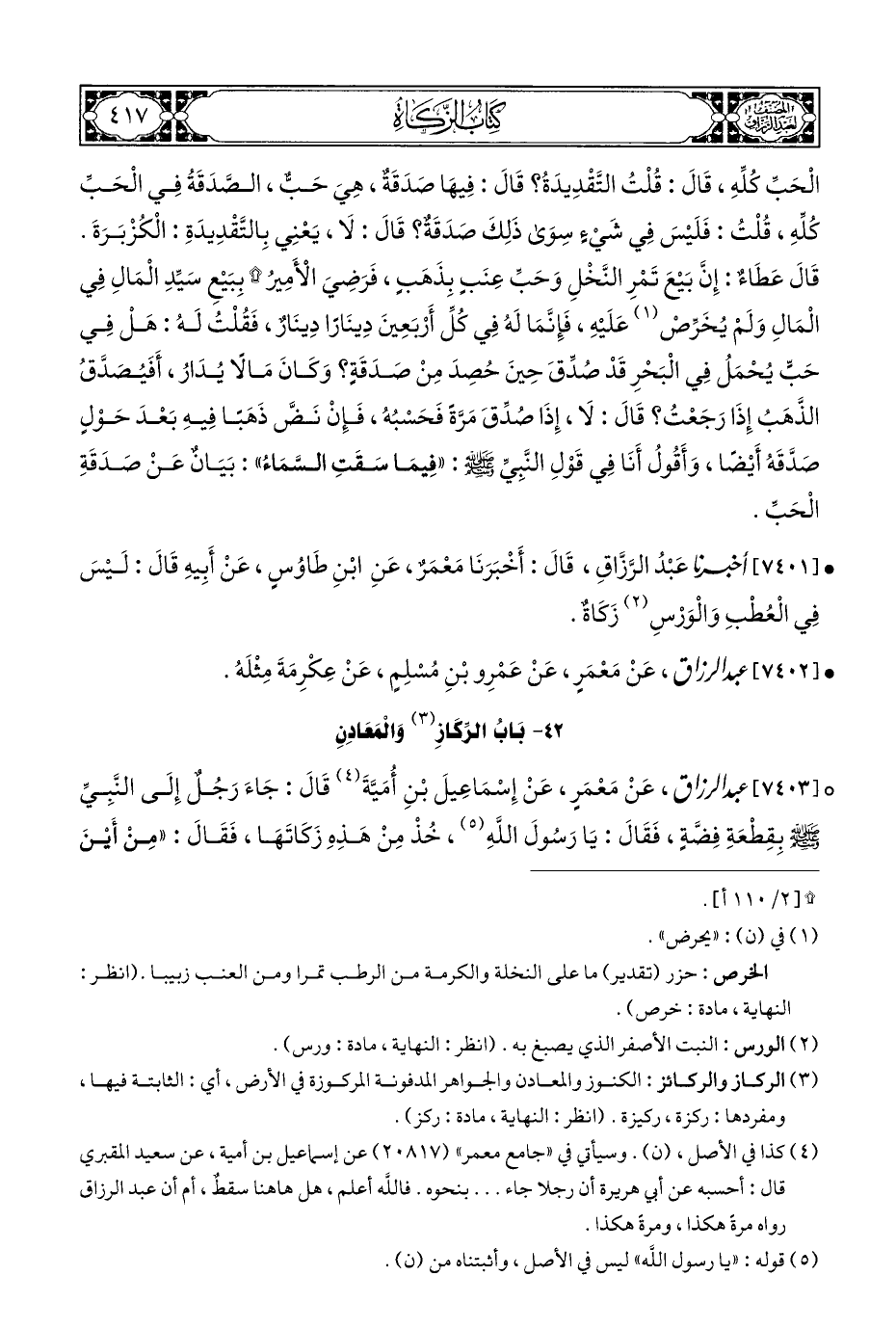 ° [٧٤٠٣] عبد الرزاق، عَنْ مَعْمَرٍ، عَنْ إِسْمَاعَيلَ بْنِ أُمَيَّةَ (¬٤) قَالَ: جَاءَ رَجُلٌ إِلَى النَّبِيِّ - صلى الله عليه وسلم - بِقِطْعَةِ فِضَّةٍ، فَقَالَ: يَا رَسُولَ اللَّهِ (¬٥)، خُذْ مِنْ هَذِهِ زَكَاتَهَا، فَقَالَ: "مِنْ أَيْنَ