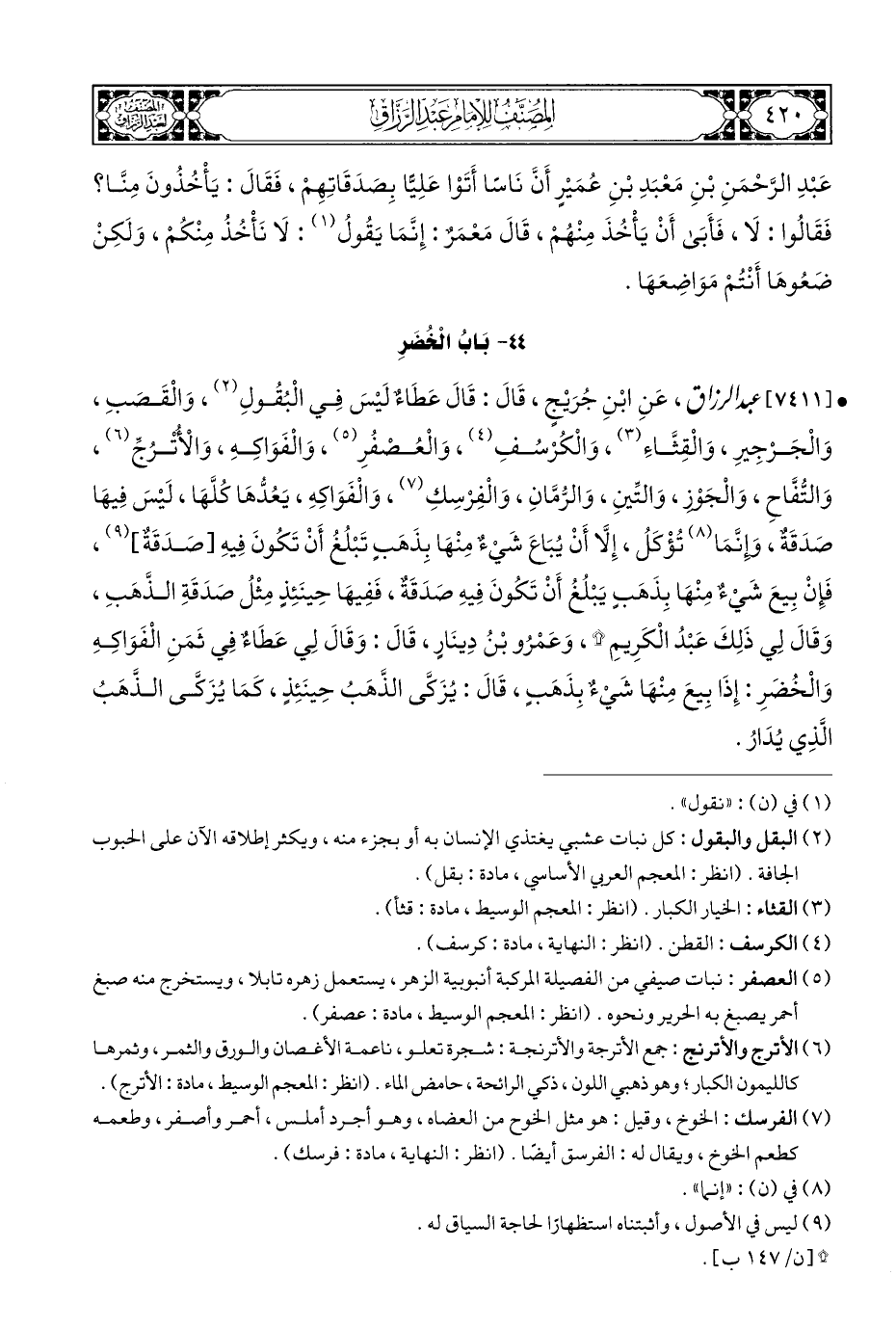 • [٧٤١١] عبد الرزاق، عَنِ ابْنِ جُرَيْجٍ، قَالَ: قَالَ عَطَاءٌ لَيْسَ فِي الْبُقُولِ (¬٢)، وَالْقَصبِ، وَالْجَرْجِيرِ، وَالْقِثَّاءِ (¬٣)، وَالْكُرْسُفِ (¬٤)، وَالْعُصْفُرِ (¬٥)، وَالْفَوَاكِهِ، وَالْأُتْرُجِّ (¬٦)، وَالتُّفَّاحِ، وَالْجَوْر، وَالتِّينِ، وَالرُّمَّانِ، وَالْفِرْسِكِ (¬٧)، وَالْفَوَاكِهِ، يَعُدُّهَا كُلَّهَا، لَيْسَ فِيهَا صَدَقَةٌ، وإنَّمَا (¬٨) تُؤْكَلُ، إِلَّا أَنْ يُبَاعَ شَيءٌ مِنْهَا بِذَهَبٍ تَبْلُغُ أَنْ تَكُونَ فِيهِ [صدَقَةٌ] (¬٩)، فَإِنْ بِيعَ شَيءٌ مِنْهَا بِذَهَبٍ يَبْلُغُ أَنْ تَكُونَ فِيهِ صَدَقَةٌ، فَفِيهَا حِينَئِذٍ مِثْلُ صَدَقَةِ الذَّهَبِ، وَقَالَ لِي ذَلِكَ عَبْدُ الْكَرِيمِ *، وَعَمْرُو بْنُ دِينَارٍ، قَالَ: وَقَالَ لِي عَطَاءٌ فِي ثَمَنِ الْفَوَاكِهِ وَالْخُضَرِ: إِذَا بِيعَ مِنْهَا شَيْءٌ بِذَهَبٍ، قَالَ: يُزَكَّى الذَّهَبُ حِينَئِذٍ، كَمَا يُزَكَّى الذَّهَبُ الَّذِي يُدَارُ.