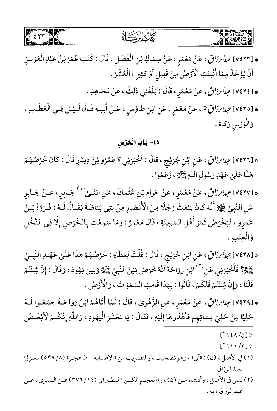 ° [٧٤٢٧] عبد الرزاق، عَنْ مَعْمَرٍ، عَنْ حَرَامِ بْنِ عُثْمَانَ، عَنِ ابْنَي (¬١) جَابِرٍ، عَنْ جَابِرٍ عَنِ النَّبِيِّ - صلى الله عليه وسلم - أَنَّهُ كَانَ يَبْعَثُ رَجُلًا مِنَ الْأَنْصَارِ مِنْ بَنِي بَيَاضَةَ يُقَالُ لَهُ: فَرْوَةُ بْنُ عَمْرٍو، فَيَخْرُصُ ثَمَرَ أَهْلِ الْمَدِينَةِ، قَالَ مَعْمَرٌ: وَمَا سَمِعْتُ بِالْخَرْصِ إِلَّا فِي النَّخْلِ وَالْعِنَبِ.