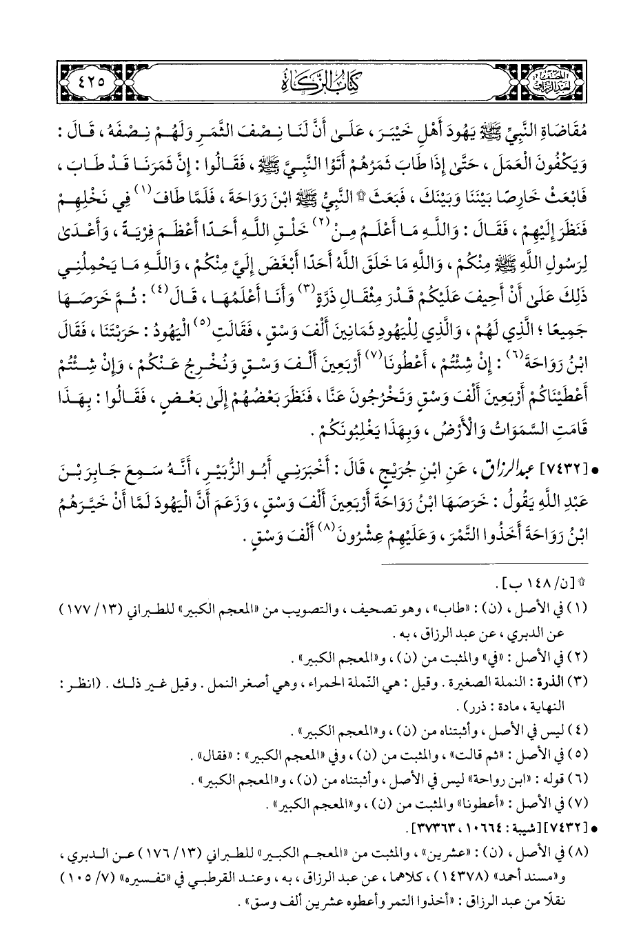 • [٧٤٣٢] عبد الرزاق، عَنِ ابْنِ جُرَيْجٍ، قَالَ: أَخْبَرَنِي أَبُو الزُّبَيْرِ، أَنَّهُ سَمِعَ جَابِرَ بْنَ عَبْدِ اللَّهِ يَقُولُ: خَرَصَهَا ابْنُ رَوَاحَةَ أَرْبَعِينَ أَلْفَ وَسْقٍ، وَزَعَمَ أَنَّ الْيَهُودَ لَمَّا أَنْ خَيَّرَهُمُ ابْنُ رَوَاحَةَ أَخَذُوا التَّمْرَ، وَعَلَيْهِمْ عَشْرُونَ (¬٨) أَلْفَ وَسْقٍ.