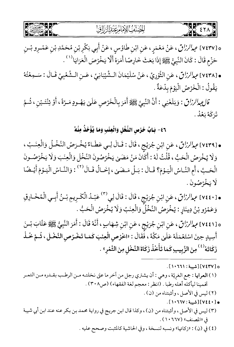 ° [٧٤٣٧] عبد الرزاق، عَنْ مَعْمَرٍ، عَنِ ابْنِ طَاوُسٍ، عَنْ أَبِي بَكْرِ بْنِ مُحَمَّدِ بْنِ عَمْرِو بْنِ حَزْمٍ قَالَ: كَانَ النَّبِيُّ - صلى الله عليه وسلم - إِذَا بَعَثَ خَارِصًا أَمَرَهُ أَلَّا يَخْرْصَ الْعَرَايَا (¬١).