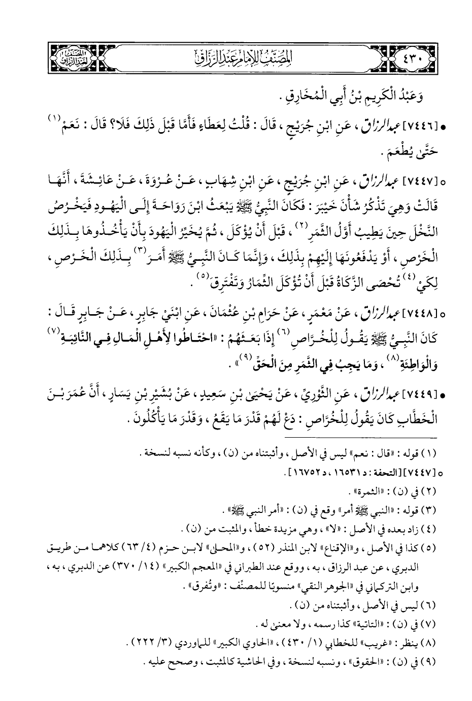 ° [٧٤٤٧] عبد الرزاق، عَنِ ابْنِ جُرَيْجٍ، عَنِ ابْنِ شِهَابٍ، عَنْ عُرْوَةَ، عَنْ عَائِشَةَ، أَنَّهَا قَالَتْ وَهِيَ تَذْكُرُ شَأْنَ خَيْبَرَ: فَكَانَ النَّبِيُّ - صلى الله عليه وسلم - يَبْعَثُ ابْنَ رَوَاحَةَ إِلَى الْيَهُودِ فَيَخْرُصُ النَّخْلَ حِينَ يَطِيبُ أَوَّلُ الثَّمَرِ (¬٢)، قَبْلَ أَنْ يُؤْكَلَ، ثُمَّ يُخَيِّرُ الْيَهُودَ بِأَنْ يَأْخُذُوهَا بِذَلِكَ الْخَرْصِ، أَوْ يَدْفَعُونَهَا إِلَيْهِمْ بِذَلِكَ، وإِنَّمَا كَانَ النَّبِيُّ - صلى الله عليه وسلم - أَمَرَ (¬٣) بِذَلِكَ الْخَرْصِ، لِكَيْ (¬٤) تُحْصى الزَّكَاةُ قَبْلَ أَنْ تُؤْكَلَ الثِّمَارُ وَتَفْتَرِقَ (¬٥).