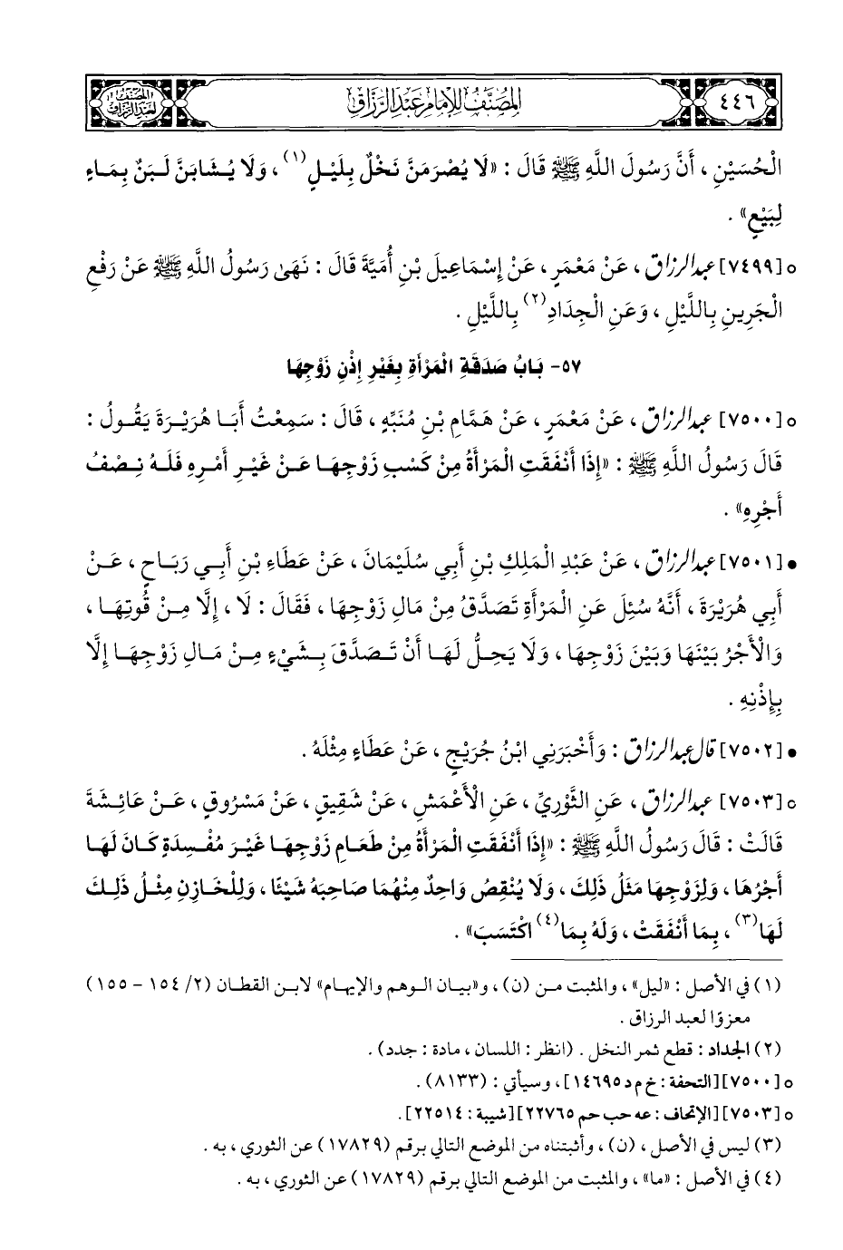 ° [٧٥٠٠] عبد الرزاق، عَنْ مَعْمَرٍ، عَنْ هَمَّامِ بْنِ مُنَبِّهٍ، قَالَ: سَمِعْتُ أَبَا هُرَيْرَةَ يَقُولُ: قَالَ رَسُولُ اللهِ - صلى الله عليه وسلم -: "إِذَا أَنْفَقَتِ الْمَرْأَةُ مِنْ كَسْبِ زَوْجِهَا عَنْ غَيْرِ أَمْرِهِ فَلَهُ نِصْفُ أَجْرِهِ".