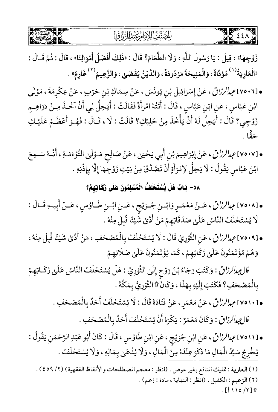 قال عبد الرزاق: وَكَتَبَ رَجَاءُ بْنُ رَوْحٍ إِلَى الثَوْرِيِّ: هَلْ يُسْتَحْلَفُ النَّاسُ عَلَى زَكَاتِهِمْ بِالْمُصْحَفِ؟ فَكَتَبَ إِلَيْهِ بِهَذَا، وَكَانَ * الثَّوْرِيُّ بِمَكَّةَ.