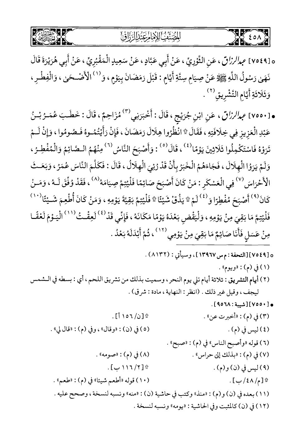 ° [٧٥٤٩] عبد الرزاق، عَنِ الثَّوْرِيِّ، عَنْ أَبِي عَبَّادٍ، عَنْ سَعِيدٍ الْمَقْبُرِيِّ، عَنْ أَبِي هُرَيْرَةَ قَالَ نَهَى رَسُولُ اللَّهِ - صلى الله عليه وسلم - عَنْ صيَامِ سِتَّةِ أَيَّامٍ: قَبْلَ رَمَضَانَ بِيَوْمٍ، وَ (¬١) الْأَضحَى، وَالْفِطْرِ، وَثَلَاثَةِ أَيَّامِ التَّشْرِيقِ (¬٢).