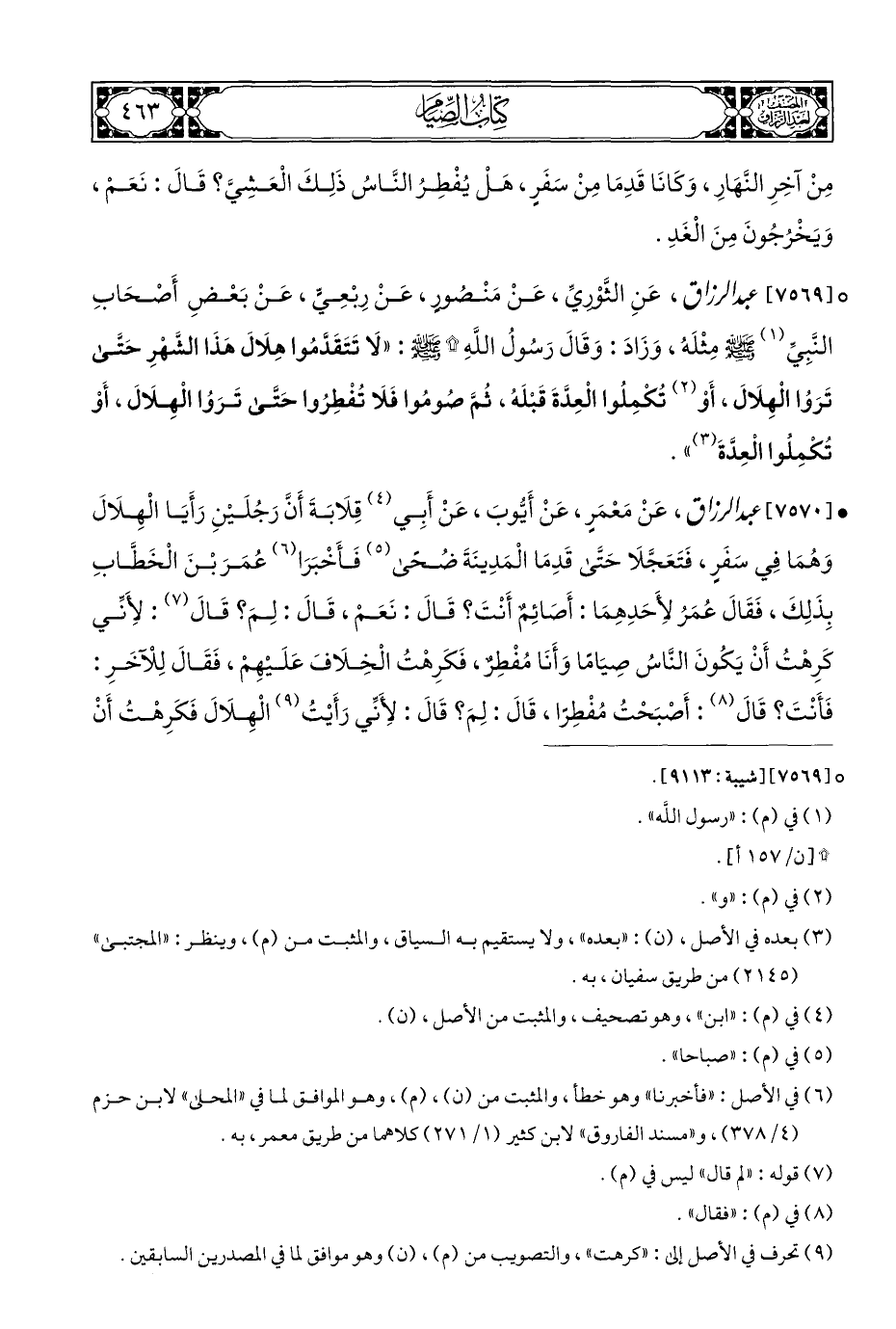 • [٧٥٧٠] عبد الرزاق، عَنْ مَعْمَرٍ، عَنْ أَيُّوبَ، عَنْ أَبِي (¬٤) قِلَابَةَ أَنَّ رَجُلَيْنِ رَأَيَا الْهِلَالَ وَهُمَا فِي سَفَرٍ، فَتَعَجَّلَا حَتَّى قَدِمَا الْمَدِينَةَ ضُحًى (¬٥) فَأَخْبَرَا (¬٦) عُمَرَ بْنَ الْخَطَّابِ بِذَلِكَ، فَقَالَ عُمَرُ لِأَحَدِهِمَا: أَصَائِمٌ أَنْتَ؟ قَالَ: نَعَمْ، قَالَ: لِمَ؟ قَالَ (¬٧): لِأَنِّي كَرِهْتُ أَنْ يَكُونَ النَّاسُ صِيَامًا وَأَنَا مُفْطِرٌ، فَكَرِهْتُ الْخِلَافَ عَلَيْهِمْ، فَقَالَ لِلْآخَرِ: فَأَنْتَ؟ قَالَ (¬٨): أَصْبَحْتُ مُفْطِرًا، قَالَ: لِمَ؟ قَالَ: لِأَنَي رَأَيْتُ (¬٩) الْهِلَالَ فَكَرِهْتُ أَنْ
