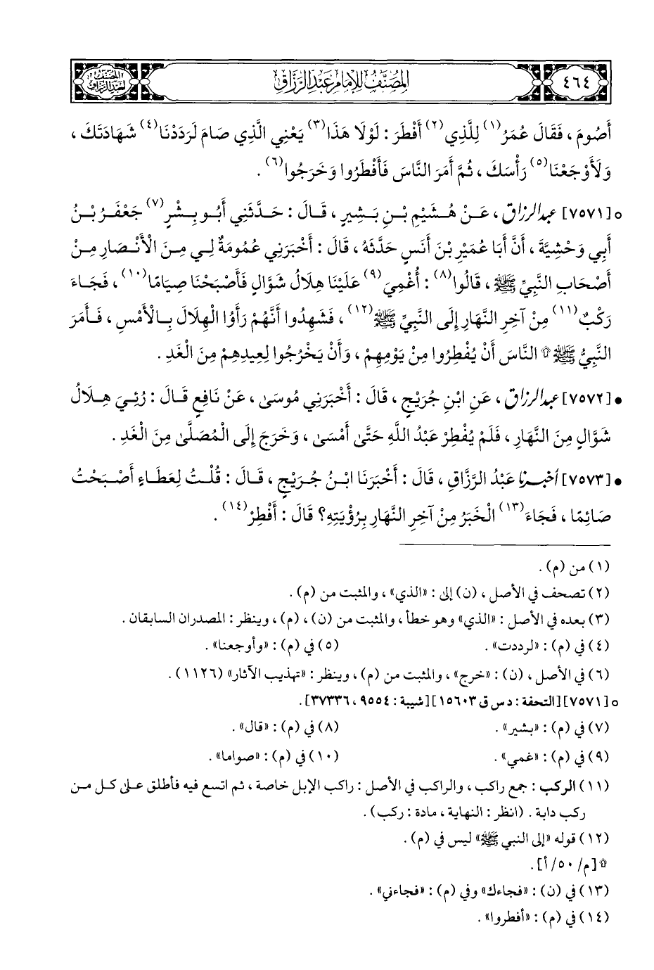 ° [٧٥٧١] عبد الرزاق، عَنْ هُشَيْمِ بْنِ بَشِيرٍ، قَالَ: حَدَّثَنِي أَبُو بِشْرٍ (¬٧) جَعْفَرُ بْنُ أَبِي وَحْشِيَّةَ، أَنَّ أَبَا عُمَيْرِ بْنَ أَنَسٍ حَدَّثَهُ، قَالَ: أَخْبَرَنِي عُمُومَةٌ لِي مِنَ الْأَنْصَارِ مِنْ أَصْحَابِ النَّبِيِّ - صلى الله عليه وسلم -، قَالُوا (¬٨): أُغْمِيَ (¬٩) عَلَيْنَا هِلَالُ شَوَّالٍ فَأَصبَحْنَا صِيَامًا (¬١٠)، فَجَاءَ رَكبٌ (¬١١) مِنْ آخِر النَّهَارِ إِلَى النَّبِيِّ - صلى الله عليه وسلم - (¬١٢)، فَشَهدُوا أَنَّهُمْ رَأَوُا الْهلَالَ بِالْأَمْس، فَأَمَرَ النَّبِيُّ - صلى الله عليه وسلم - * النَّاسَ أَنْ يُفْطِرُوا مِنْ يَوْمِهِمْ، وَأَنْ يَخْرُجُوا لِعِيدِهِمْ مِنَ الْغَدِ.