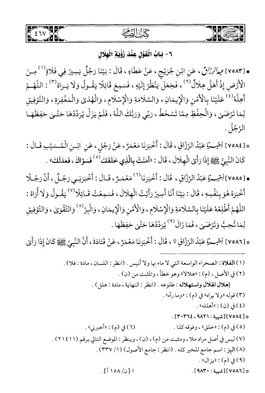 • [٧٥٨٥] أخبرنا عَبْدُ الرَّزَّاقِ، قَالَ: أَخْبَرَنَا (¬٦) مَعْمَرٌ، قَالَ: أَخْبَرَنِي رَجُلٌ، أَنَّ رَجُلًا أَخْبَرَهُ هُوَ بِنَفْسِهِ، قَالَ: بَيْنَا أنَا أَسِيرُ رَأَيْتُ الْهِلَالَ، فَسَمِعْتُ قَائِلًا (¬٧) يَقُولُ وَلَا أُرَاهُ: اللَّهُمَّ أَطْلِعْهُ عَلَيْنَا بِالسَّلَامَةِ وَالْإِسْلَامِ، وَالْأَمْنِ وَالْإِيمَانِ، وَالْبِرِّ (¬٨) وَالتَّقْوَى، وَالتَّوْفِيقِ لِمَا تُحِبُّ وَتَرْضَى، فَمَا زَالَ (¬٩) يُرَدِّدُهَا حَتَّى حَفِظَهَا.