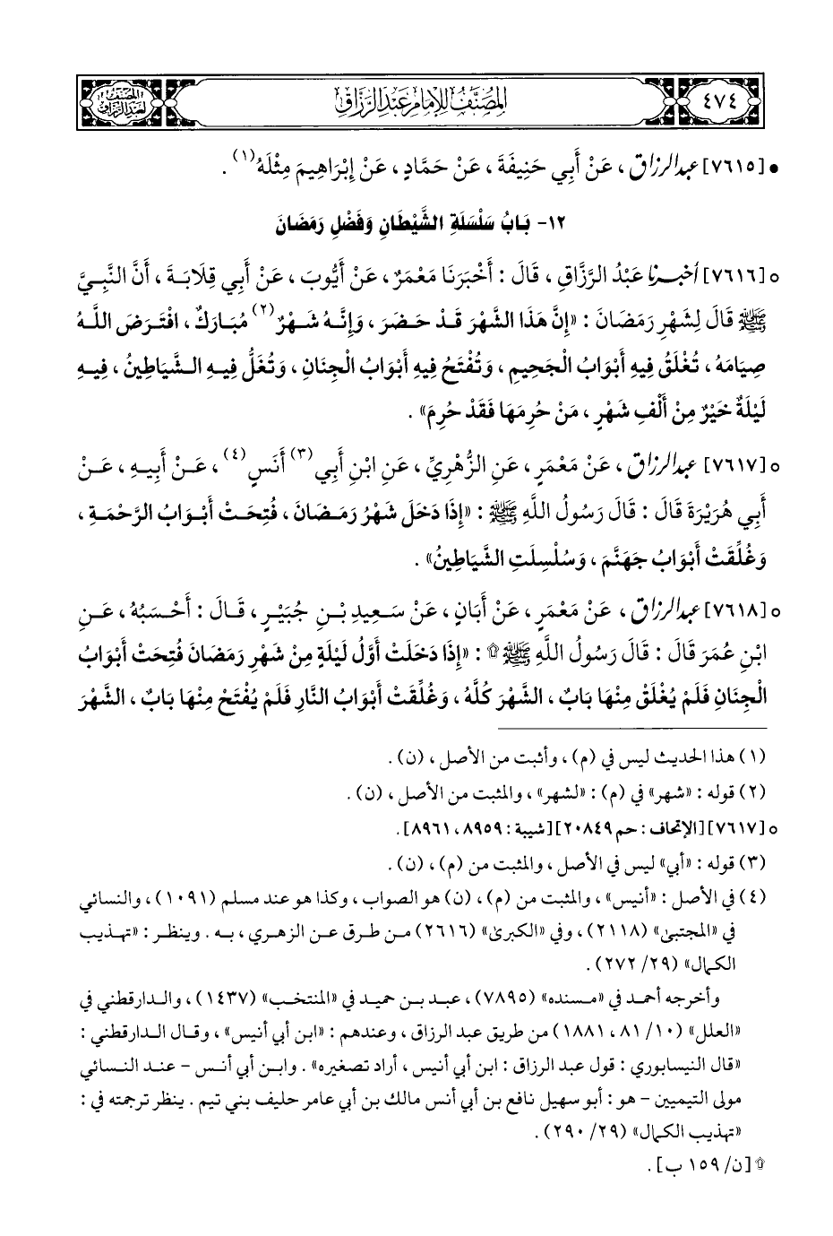 ° [٧٦١٧] عبد الرزاق، عَنْ مَعْمَرٍ، عَنِ الزُّهْرِيِّ، عَنِ ابْنِ أَبِي (¬٣) أَنَسٍ (¬٤)، عَنْ أَبِيهِ، عَنْ أَبِي هُرَيْرَةَ قَالَ: قَالَ رَسُولُ اللَّهِ - صلى الله عليه وسلم -: "إِذَا دَخَلَ شَهْرُ رَمَضَانَ، فُتِحَتْ أَبْوَابُ الرَّحْمَةِ، وَغُلِّقَتْ أَبْوَابُ جَهَنَّمَ، وَسُلْسِلَتِ الشَّيَاطِينُ".