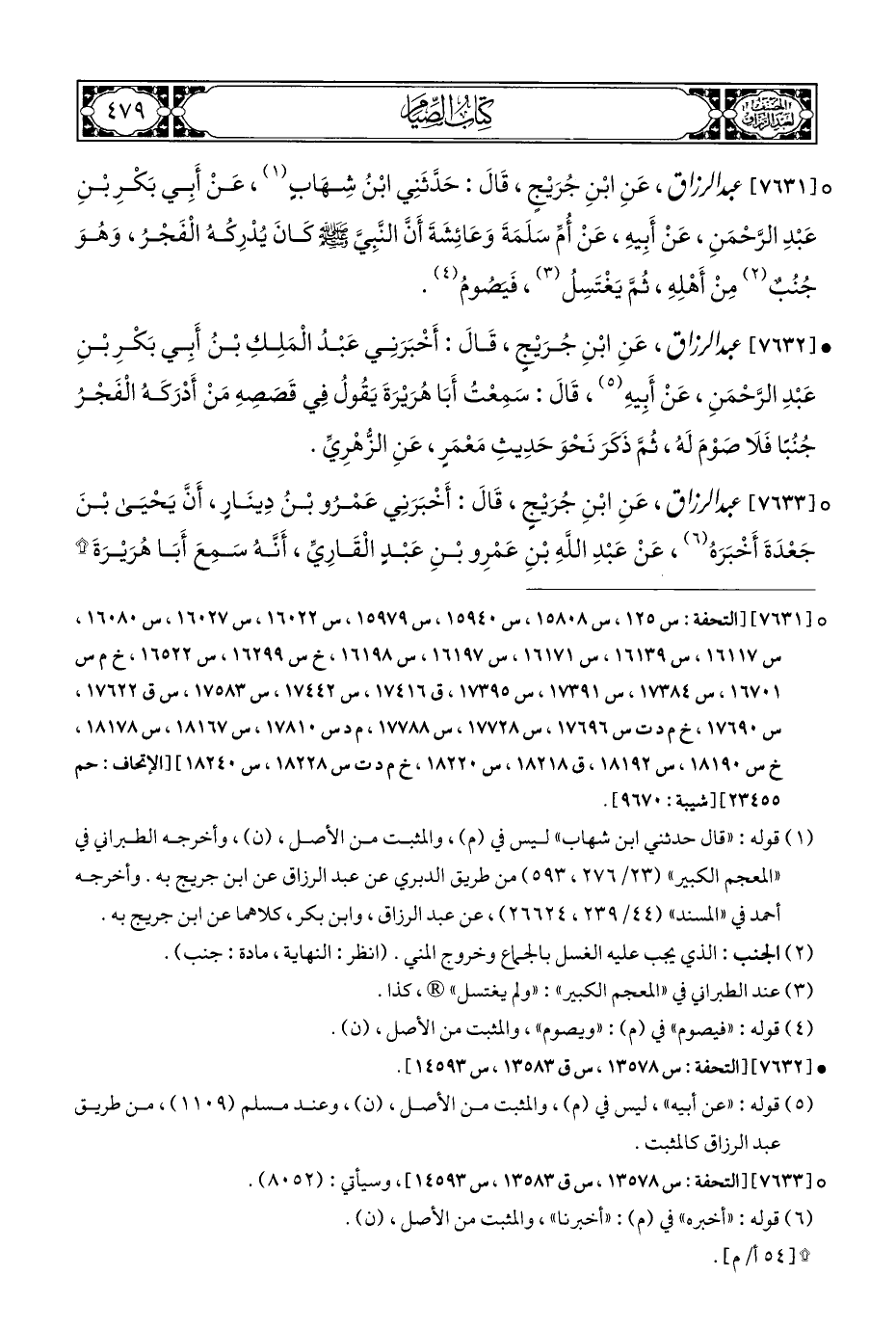 ° [٧٦٣١] عبد الرزاق عَنِ ابْنِ جُرَيْجٍ، قَالَ: حَدَّثَنِي ابْنُ شِهَابٍ (¬١)، عَنْ أَبِي بَكْرِ بْنِ عَبْدِ الرَّحْمَنِ، عَنْ أَبِيهِ، عَنْ أُمِّ سَلَمَةَ وَعَائِشَةَ أَنَّ النَّبِي - صلى الله عليه وسلم - كَانَ يُدْرِكُهُ الْفَجْرُ، وَهُوَ جُنُبٌ (¬٢) مِنْ أَهْلِهِ، ثُمَّ يَغْتَسِلُ (¬٣)، فَيصُومُ (¬٤).