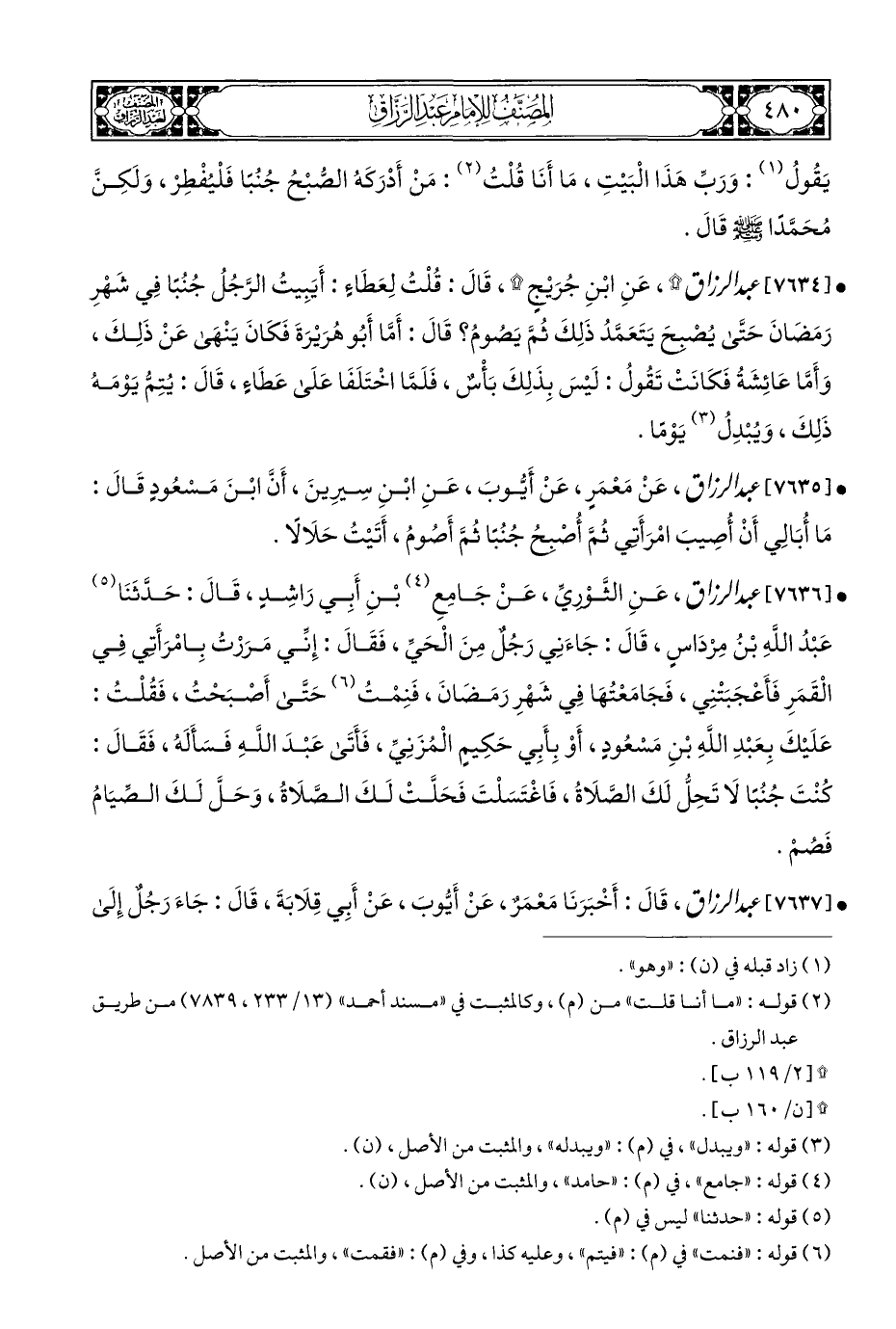 • [٧٦٣٦] عبد الرزاق، عَنِ الثَّوْرِيِّ، عَنْ جَامِعِ (¬٤) بْنِ أَبِي رَاشِدٍ، قَالَ: حَدَّثَنَا (¬٥) عَبْدُ اللَّهِ بْنُ مِرْدَاسٍ، قَالَ: جَاءَنِي رَجُلٌ مِنَ الْحَيِّ، فَقَالَ: إِنِّي مَرَرْتُ بِامْرَأَتِي فِي الْقَمَرِ فَأَعْجَبَتْنِي، فَجَامَعْتُهَا فِي شَهْرِ رَمَضَانَ، فَنِمْتُ (¬٦) حَتَّى أَصْبَحْتُ، فَقُلْتُ: عَلَيْكَ بِعَبْدِ اللَّهِ بْنِ مَسْعُودٍ، أَوْ بِأَبِي حَكِيمٍ الْمُزَنِيِّ، فَأَتَى عَبْدَ اللَّهِ فَسَأَلَهُ، فَقَالَ: كُنْتَ جُنُبًا لَا تَحِلُّ لَكَ الصَّلَاةُ، فَاغْتَسَلْتَ فَحَلَّتْ لَكَ الصَّلَاةُ، وَحَلَّ لَكَ الصِّيَامُ فَصُمْ.