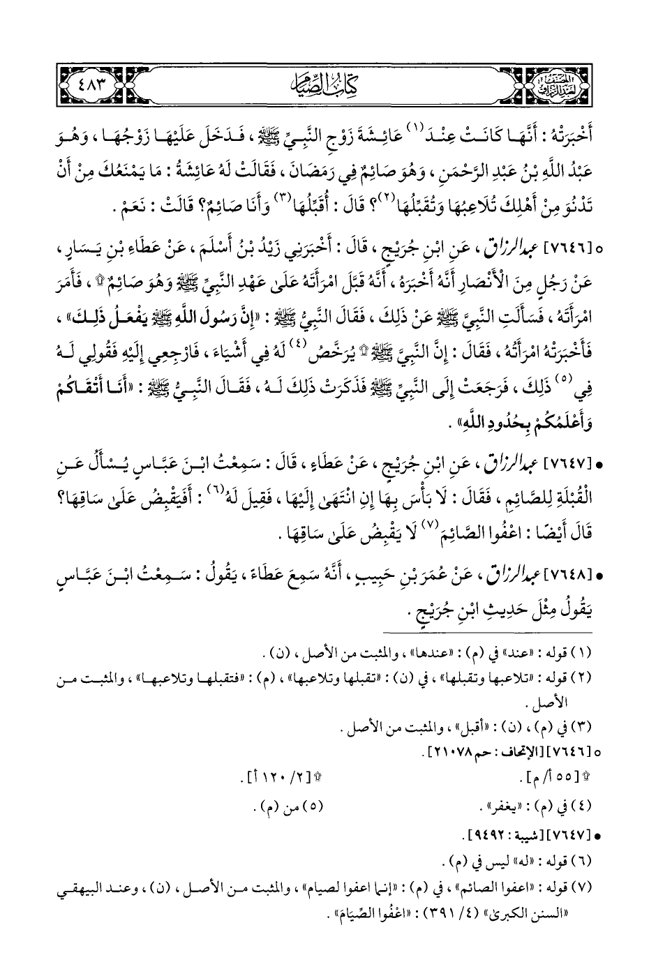 ° [٧٦٤٦] عبد الرزاق، عَنِ ابْنِ جُرَيْجٍ، قَالَ: أَخْبَرَنِي زَيْدُ بْنُ أَسْلَمَ، عَنْ عَطاءِ بْنِ يَسَارٍ، عَنْ رَجُلٍ مِنَ الْأَنْصَارِ أَنَّهُ أَخْبَرَهُ، أَنَّهُ قَبَّلَ امْرَأَتَهُ عَلَى عَهْدِ النَّبِيِّ - صلى الله عليه وسلم - وهُوَ صَائِم *، فَأَمَرَ امْرَأَتَهُ، فَسَأَلَتِ النَّبِيَّ - صلى الله عليه وسلم - عَنْ ذَلِكَ، فَقَالَ النَّبِيُّ - صلى الله عليه وسلم -: "إِنَّ رَسُولَ اللَّهِ - صلى الله عليه وسلم - يَفْعَلُ ذَلِكَ"، فَأَخْبَرَتْهُ امْرَأَتُهُ، فَقَالَ: إِنَّ النَّبِيَّ - صلى الله عليه وسلم - * يُرَخَّصُ (¬٤) لَهُ فِي أَشْيَاءَ، فَارْجِعِي إِلَيْهِ فَقُولِي لَهُ فِيْ (¬٥) ذَلِكَ، فَرَجَعَتْ إِلَى النَّبِيِّ - صلى الله عليه وسلم - فَذَكَرَتْ ذَلِكَ لَهُ، فَقَالَ النَّبِيُّ - صلى الله عليه وسلم -: "أَنَا أَتْقَاكُمْ وَأَعْلَمُكُمْ بِحُدُودِ اللَّهِ".