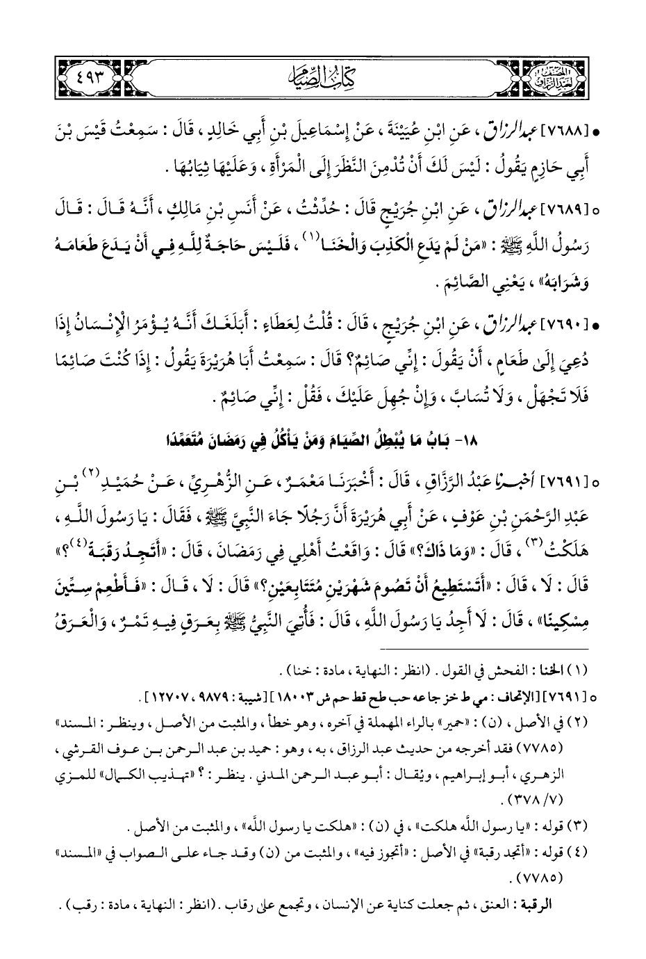 ° [٧٦٩١] أخبرنا عَبْدُ الرَّزَّاقِ، قَالَ: أَخْبَرَنَا مَعْمَرٌ، عَنِ الزُّهْرِيِّ، عَنْ حُمَيْدِ (¬٢) بْنِ عَبْدِ الرَّحْمَنِ بْنِ عَوْفٍ، عَنْ أَبِي هُرَيْرَةَ أَنَّ رَجُلًا جَاءَ النَّبِيَّ - صلى الله عليه وسلم -، فَقَالَ: يَارَسُولَ اللَّهِ، هَلَكْتُ (¬٣)، قَالَ: "وَمَا ذَاكَ؟ " قَالَ: وَاقَعْتُ أَهْلِي فِي رَمَضَانَ، قَالَ: "أَتَجِدُ رَقَبَةً (¬٤)؟ " قَالَ: لَا، قَالَ: "أَتَسْتَطِيعُ أَنْ تَصُومَ شَهْرَيْنِ مُتَتَابِعَيْنِ؟ " قَالَ: لَا، قَالَ: "فَأَطْعِمْ سِتَينَ مِسْكِينًا"، قَالَ: لَا أَجِدُ يَا رَسُولَ اللَّهِ، قَالَ: فَأُتيَ النَّبِيُّ - صلى الله عليه وسلم - بِعَرَقٍ فِيهِ تَمْرٌ، وَالْعَرَقُ