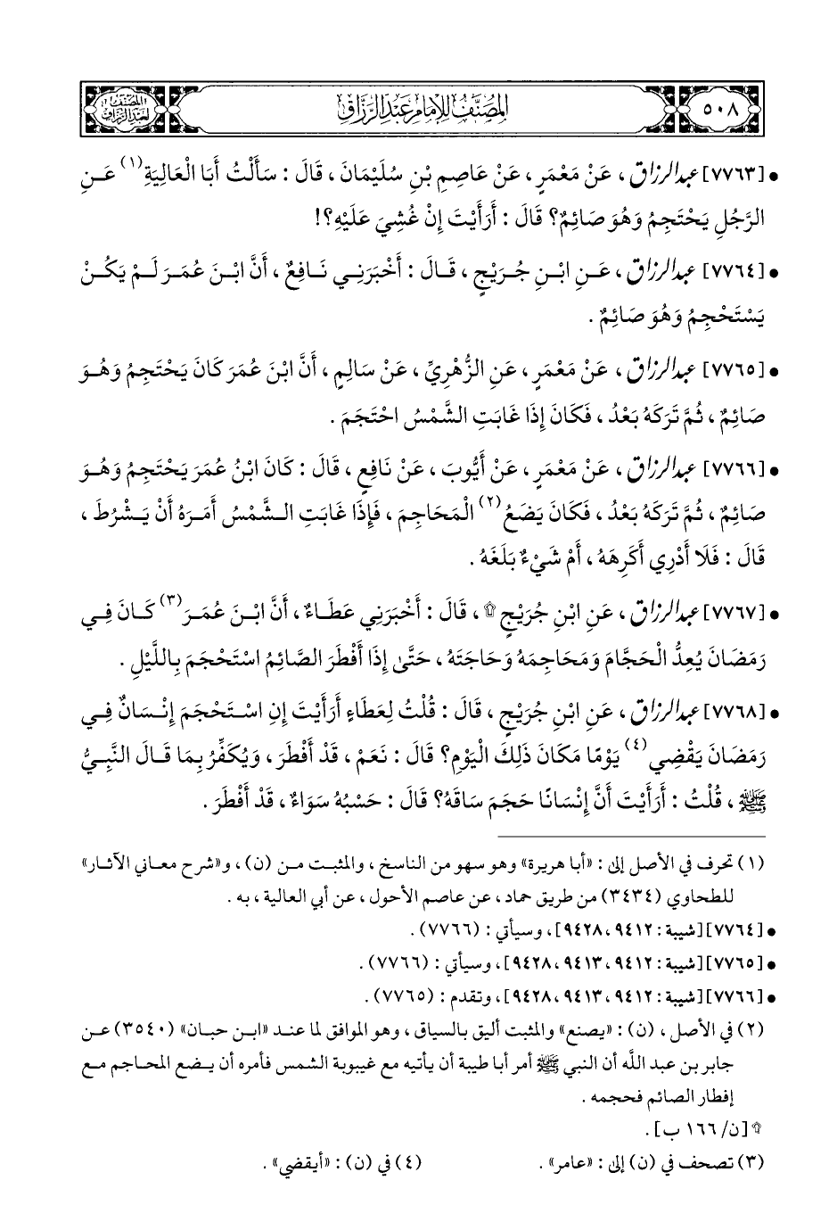 • [٧٧٦٧] عبد الرزاق، عَنِ ابْنِ جُرَيْجٍ *، قَالَ: أَخْبَرَنِي عَطَاءٌ، أَنَّ ابْنَ عُمَرَ (¬٣) كَانَ فِي رَمَضَانَ يُعِدُّ الْحَجَّامَ وَمَحَاجِمَهُ وَحَاجَتَهُ، حَتَّى إِذَا أَفْطَرَ الصَّائِمُ اسْتَحْجَمَ بِاللَّيْلِ.