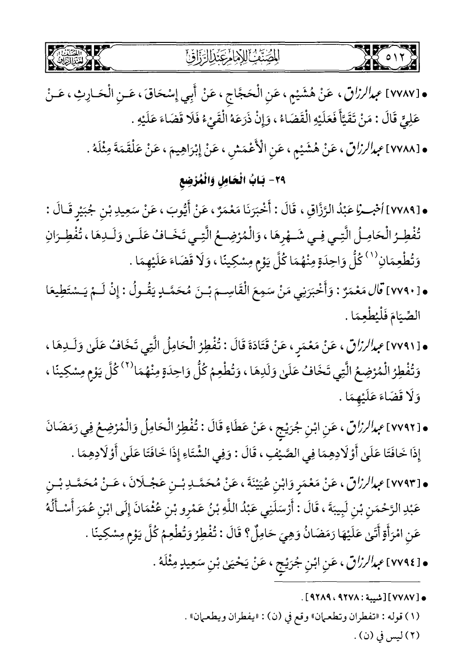 • [٧٧٨٩] أخبرنا عَبْدُ الرَّزَّاقِ، قَالَ: أَخْبَرَنَا مَعْمَرٌ، عَنْ أَيُّوبَ، عَنْ سَعِيدِ بْنِ جُبَيْر قَالَ: تُفْطِرُ الْحَامِلُ الَّتِي فِي شَهْرِهَا، وَالْمُرْضِعُ الَّتِي تَخَافُ عَلَى وَلَدِهَا، تُفْطِرَانِ وَتُطْعِمَانِ (¬١) كُلُّ وَاحِدَةٍ مِنْهُمَا كُلَّ يَوْمٍ مِسْكِينًا، وَلَا قَضَاءَ عَلَيْهِمَا.