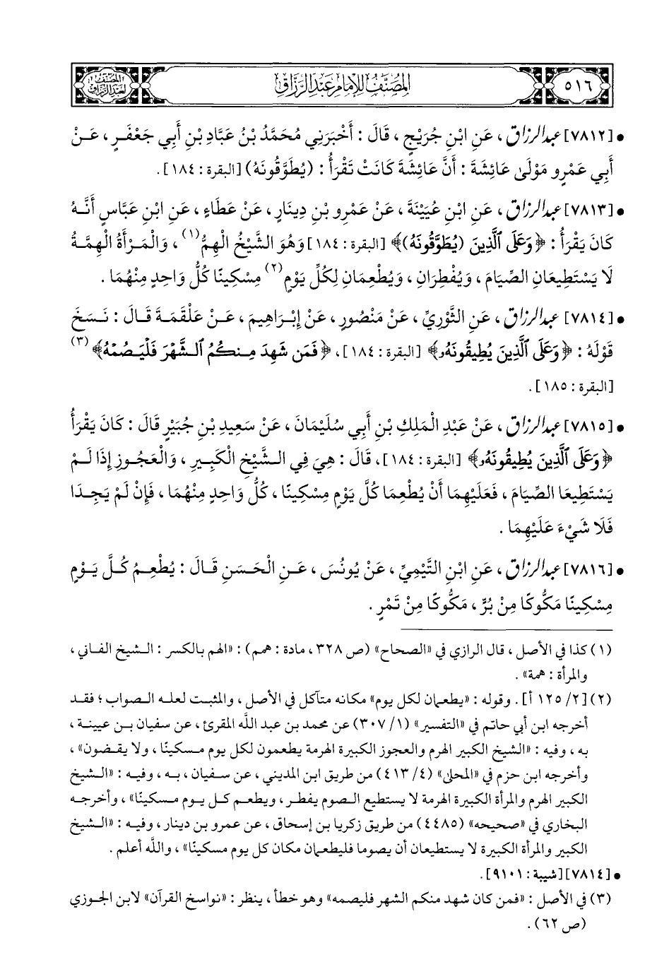 • [٧٨١٣] عبد الرزاق، عَنِ ابْنِ عُيَيْنَةَ، عَنْ عَمْرِو بْنِ دِينَارٍ، عَنْ عَطَاءٍ، عَنِ ابْنِ عَبَّاسٍ أَنَّهُ كَانَ يَقْرَأُ: {وَعَلَى الَّذِينَ (يُطِوِّقُونَهُ)} [البقرة: ١٨٤] وَهُوَ الشَّيْخُ الْهِمُّ (¬١)، وَالْمَرْأَةُ الْهِمَّةُ لَا يَسْتَطِيعَانِ الصِّيَامَ، وَيُفْطِرَانِ، وَيُطْعِمَانِ لِكُلِّ يَوْمٍ (¬٢) مِسْكِينًا كُلُّ وَاحِدٍ مِنْهُمَا.