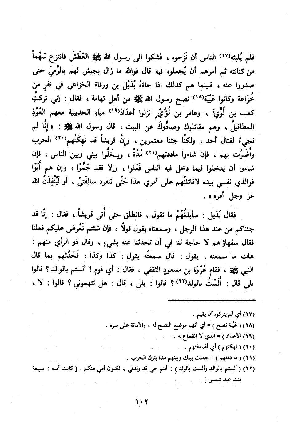فَلَمْ يُلْبِثْهُ [ (17) ] النَّاسُ أَنْ نَزَحُوهُ، فَشَكَوْا إِلَى رَسُولِ اللهِ صَلَّى الله عليه وَسَلَّمَ الْعَطَشَ فَانْتَزَعَ سَهْمًا من كنانة ثُمَّ أَمَرَهُمْ أَنْ يَجْعَلُوهُ فيه قال فو الله مَا زَالَ يَجِيشُ لَهُمْ بِالرَّمِيِّ حَتَّى صَدَرُوا عَنْهُ، فَبَيْنَمَا هُمْ كَذَلِكَ إِذَا جَاءَهُ بُدَيْلُ بْنُ وَرْقَاءَ الْخُزَاعِيُّ فِي نَفَرٍ مِنْ خُزَاعَةَ وَكَانُوا عَيْبَةَ [ (18) ] نُصْحِ رَسُولِ اللهِ صَلَّى اللهُ عَلَيْهِ وَسَلَّمَ مِنْ أَهْلِ تِهَامَةَ، فَقَالَ: إِنِّي تَرَكْتُ كَعْبَ بْنَ لُؤَيٍّ، وَعَامِرَ بْنَ لُؤَيٍّ نَزَلُوا أَعْدَادَ [ (19) ] مِيَاهِ الْحُدَيْبِيَةِ مَعَهُمُ الْعُوذُ الْمَطَافِيلُ، وَهُمْ مُقَاتِلُوكَ وَصَادُّوكَ عَنِ الْبَيْتِ، قَالَ رَسُولُ اللهِ صَلَّى اللهُ عليه وسلم: «إنا لم نجيء لِقِتَالِ أَحَدٍ، وَلَكِنَّا جِئْنَا مُعْتَمِرِينَ، وَإِنَّ قُرَيْشًا قَدْ نَهِكَتْهُمُ [ (20) ] الْحَرْبُ وَأَضَرَّتْ بِهِمْ، فَإِنْ شَاءُوا مَادَدْتُهُمْ [ (21) ] مُدَّةً، وَيُخَلُّوا بَيْنِي وَبَيْنَ النَّاسِ، فَإِنْ شَاءُوا أَنْ يَدْخُلُوا فِيمَا دَخَلَ فِيهِ النَّاسُ فَعَلُوا، وَإِلَّا فَقَدْ جَمُّوا، وإن هم أبوا فو الذي نَفْسِي بِيَدِهِ لَأُقَاتِلَنَّهُمْ عَلَى أَمْرِي هَذَا حَتَّى تَنْفَرِدَ سَالِفَتِي، أَوْ لَيُنْفِذَنَّ اللهُ عَزَّ وَجَلَّ أَمْرَهُ» .